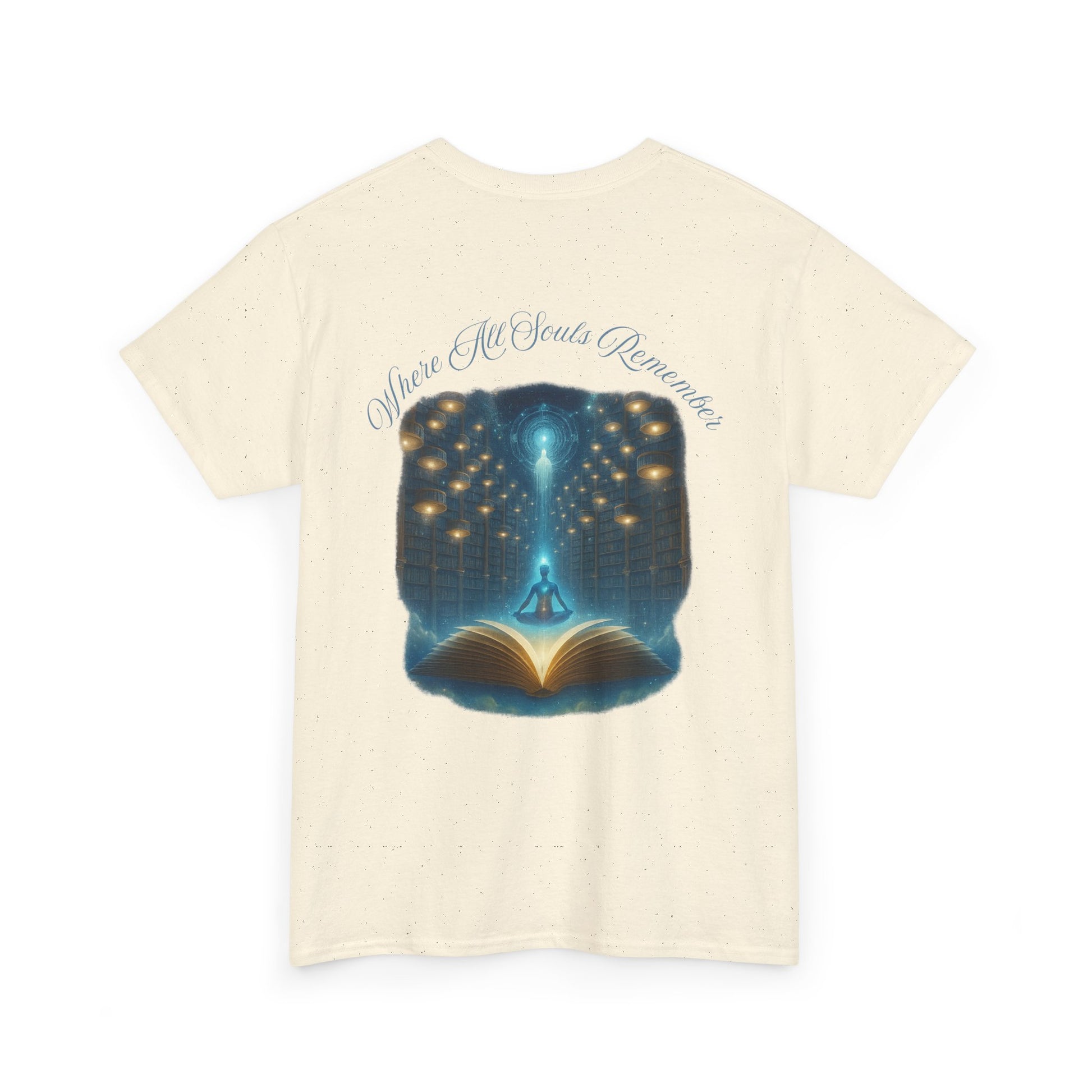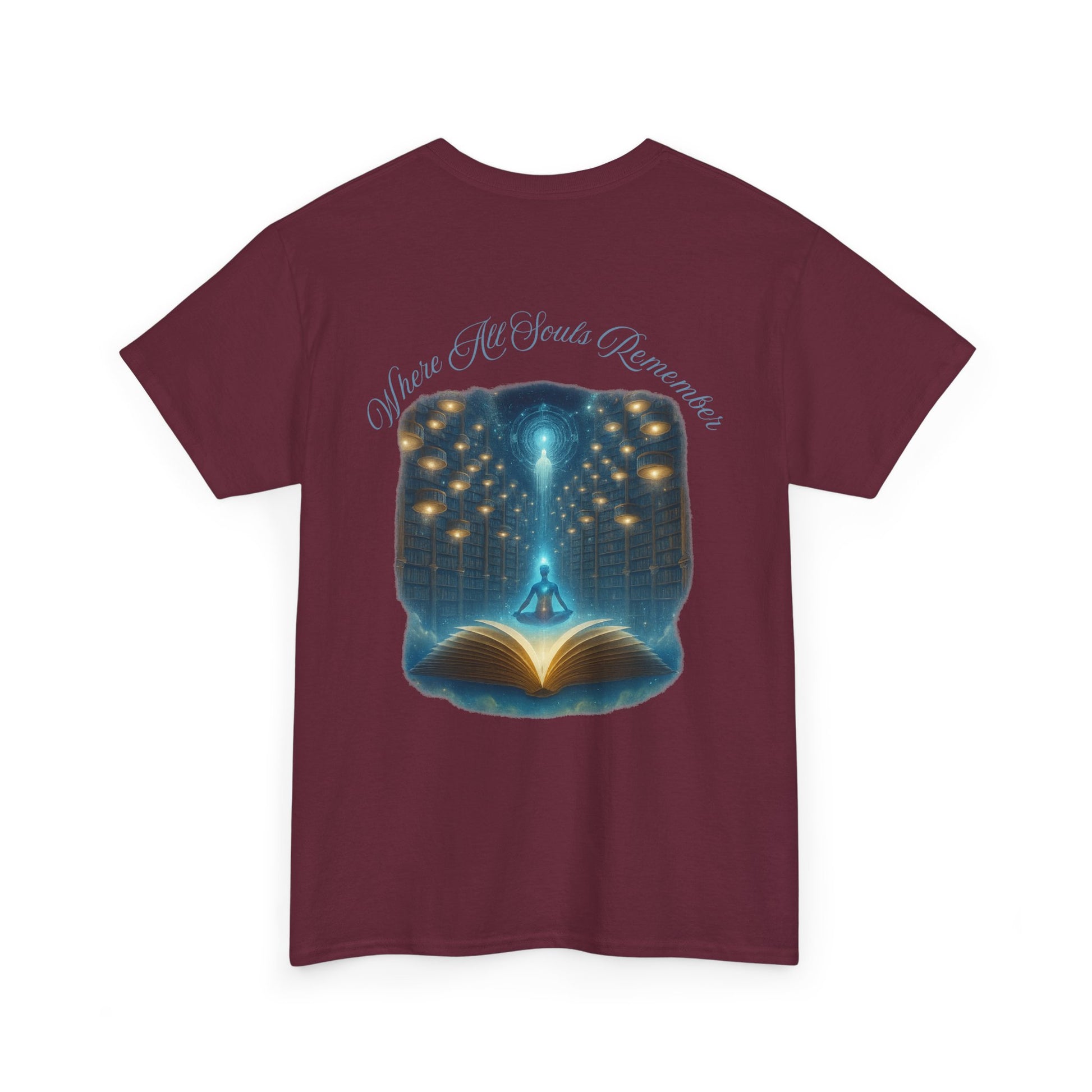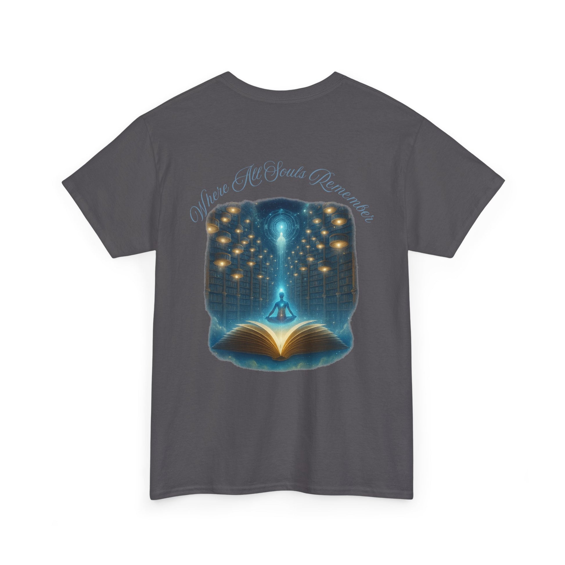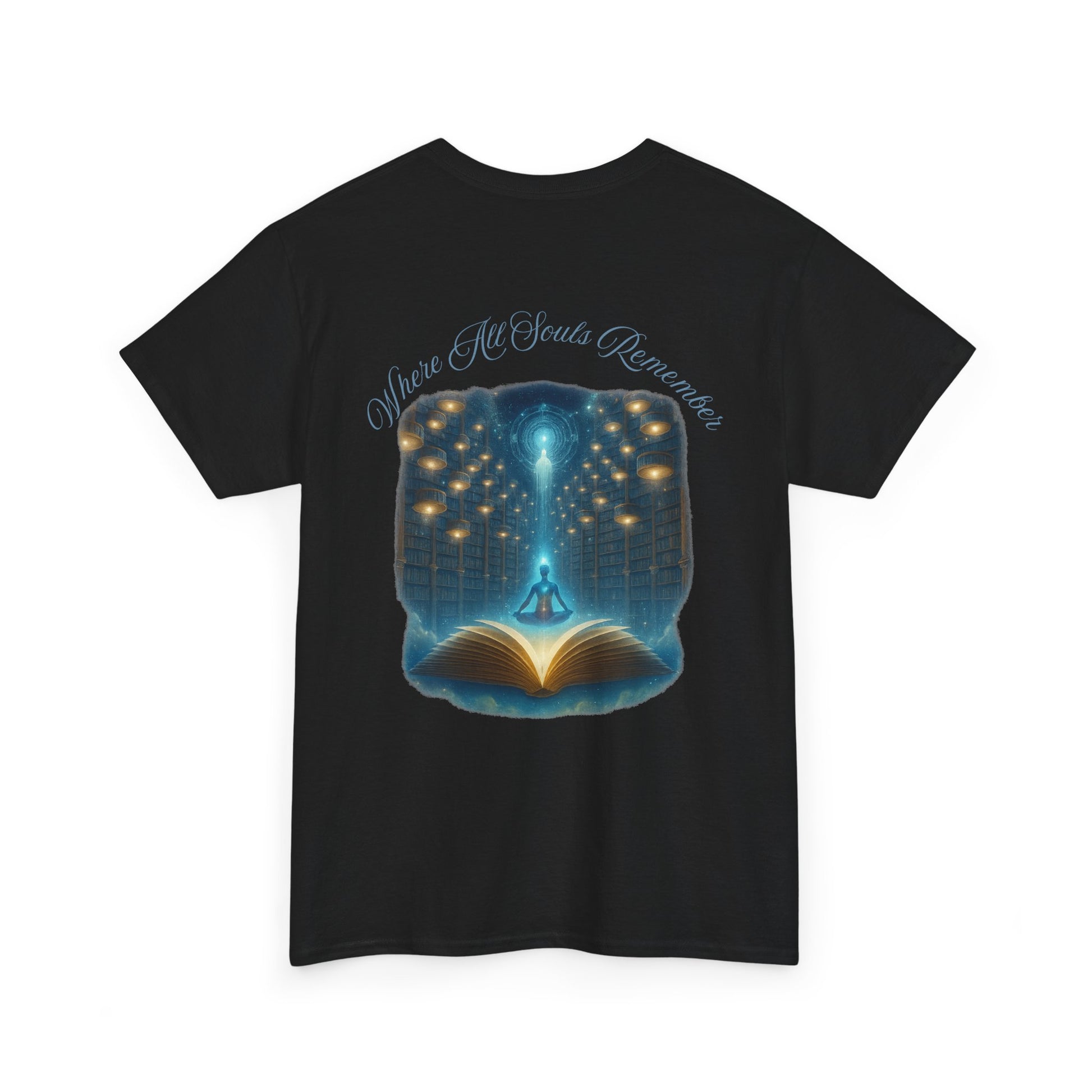 On the back, the design expands into a full spiritual library glowing with light. A meditating figure rises from the pages as luminous shelves stretch into infinity. The phrase Where All Souls Remember brings the message together with a sense of peace, belonging, and higher awareness. This tee is made for intuitive seekers, energy sensitive souls, and anyone walking a conscious path.