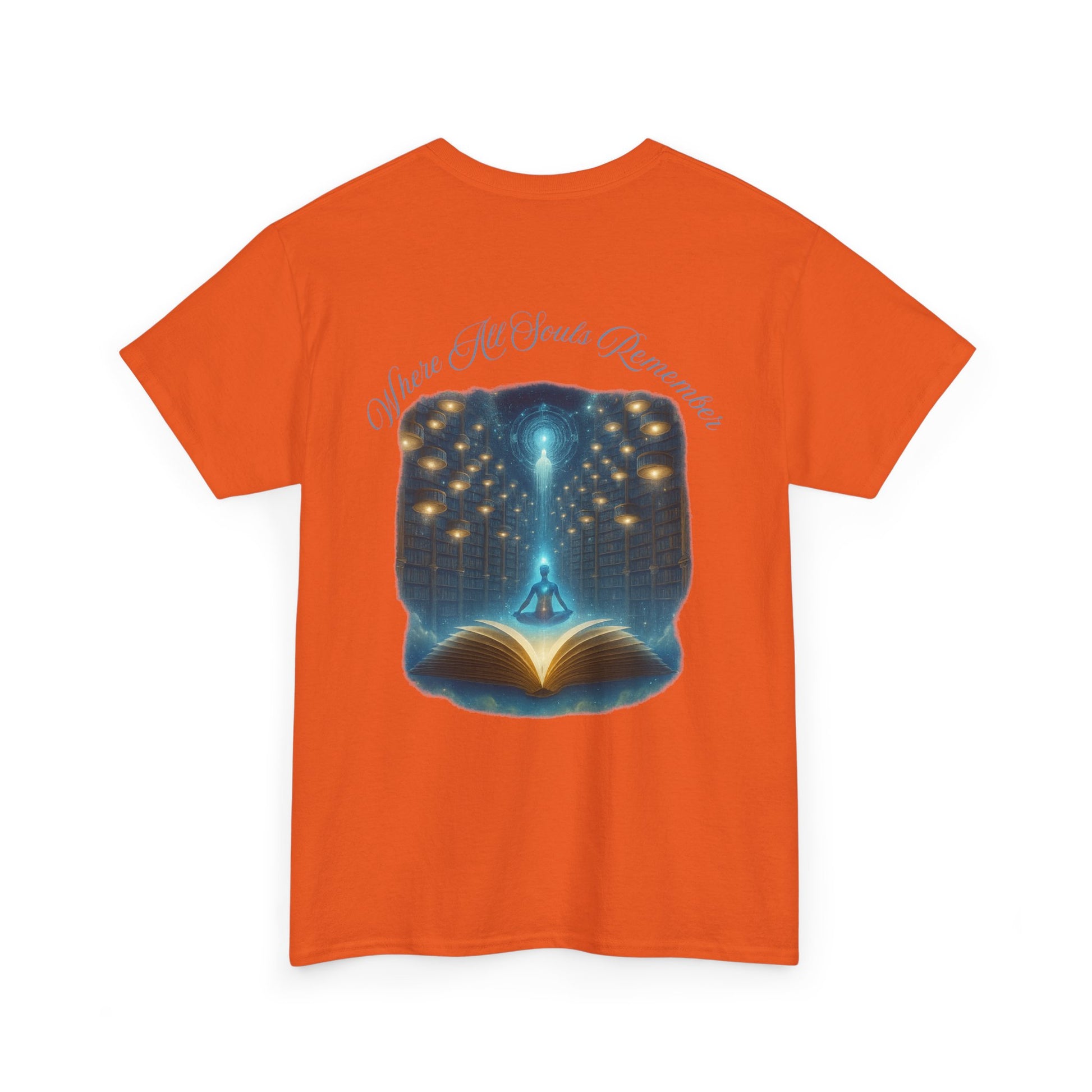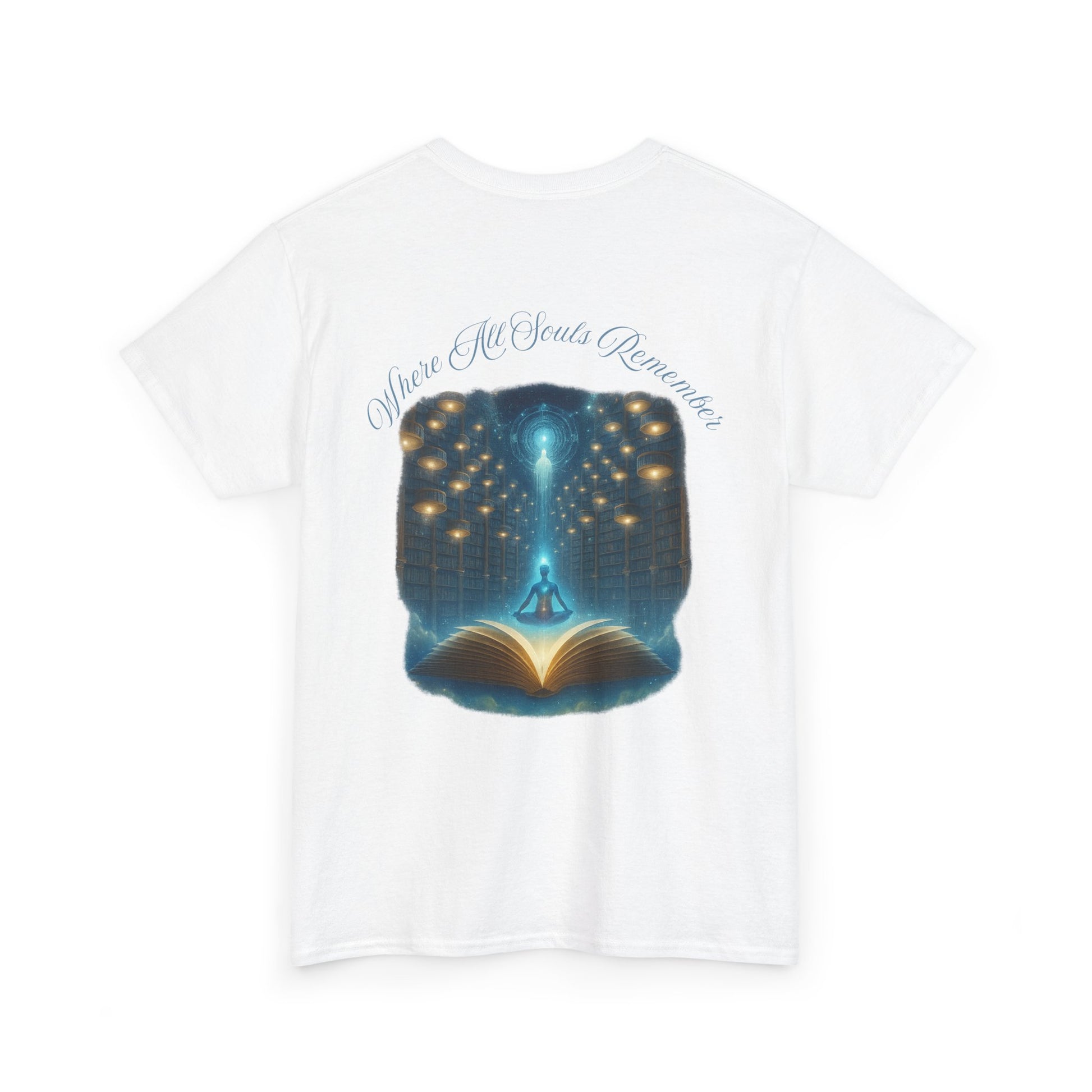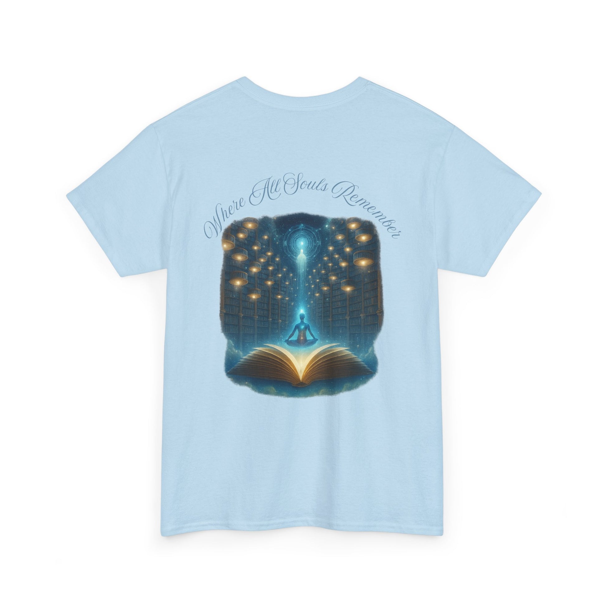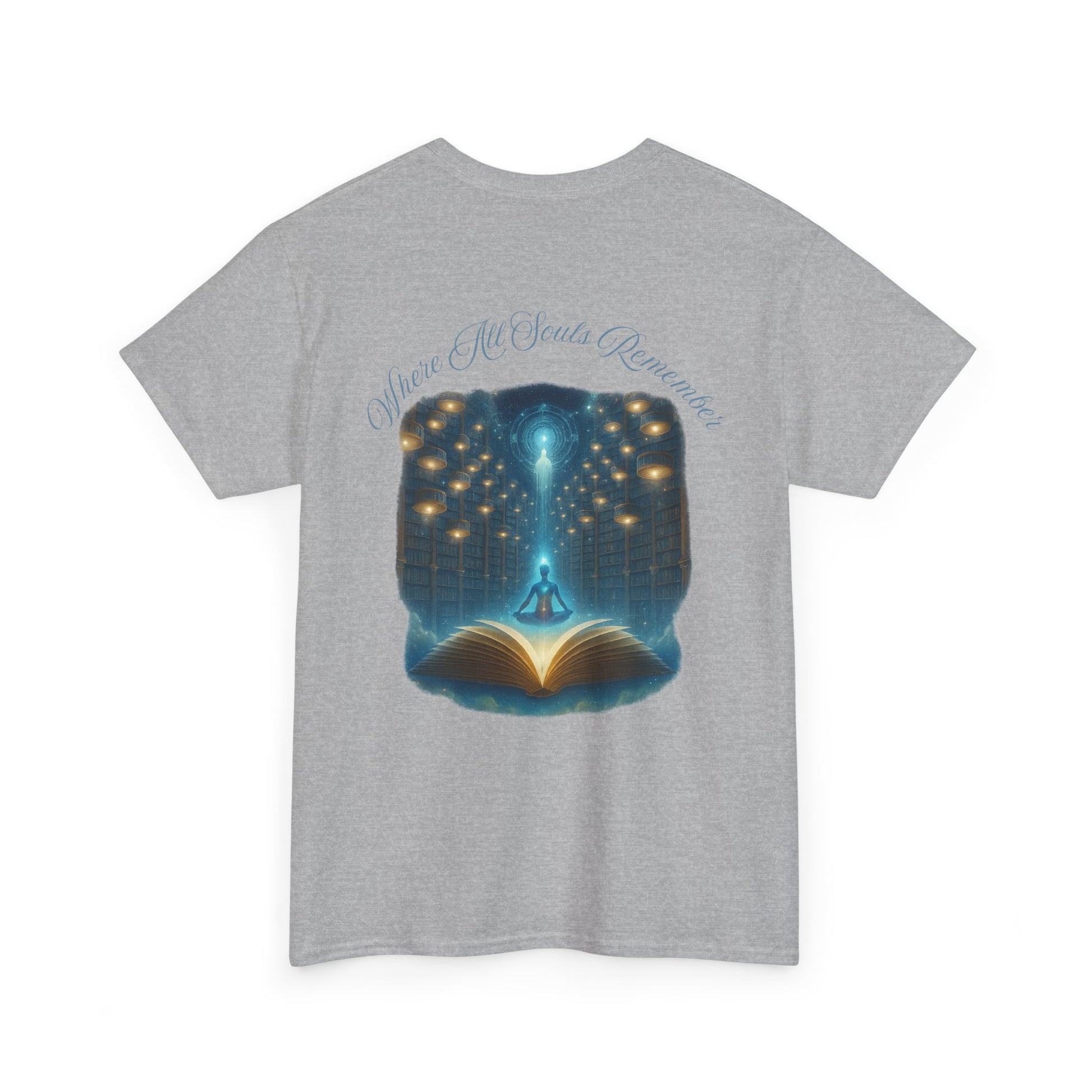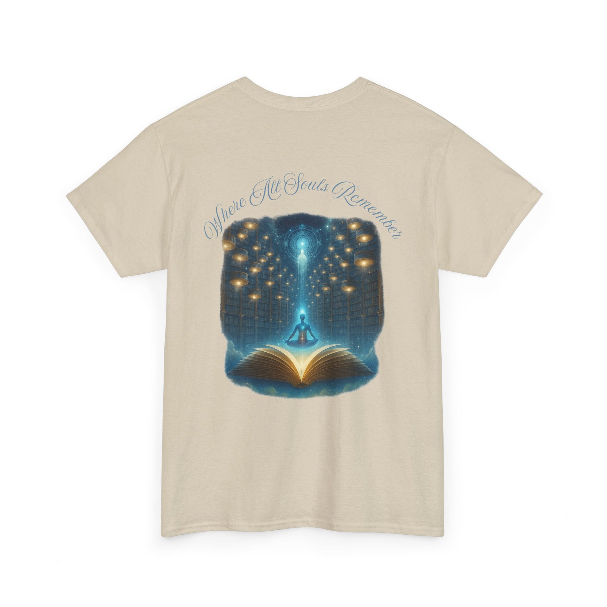 On the back, the design expands into a full spiritual library glowing with light. A meditating figure rises from the pages as luminous shelves stretch into infinity. The phrase Where All Souls Remember brings the message together with a sense of peace, belonging, and higher awareness. This tee is made for intuitive seekers, energy sensitive souls, and anyone walking a conscious path.
