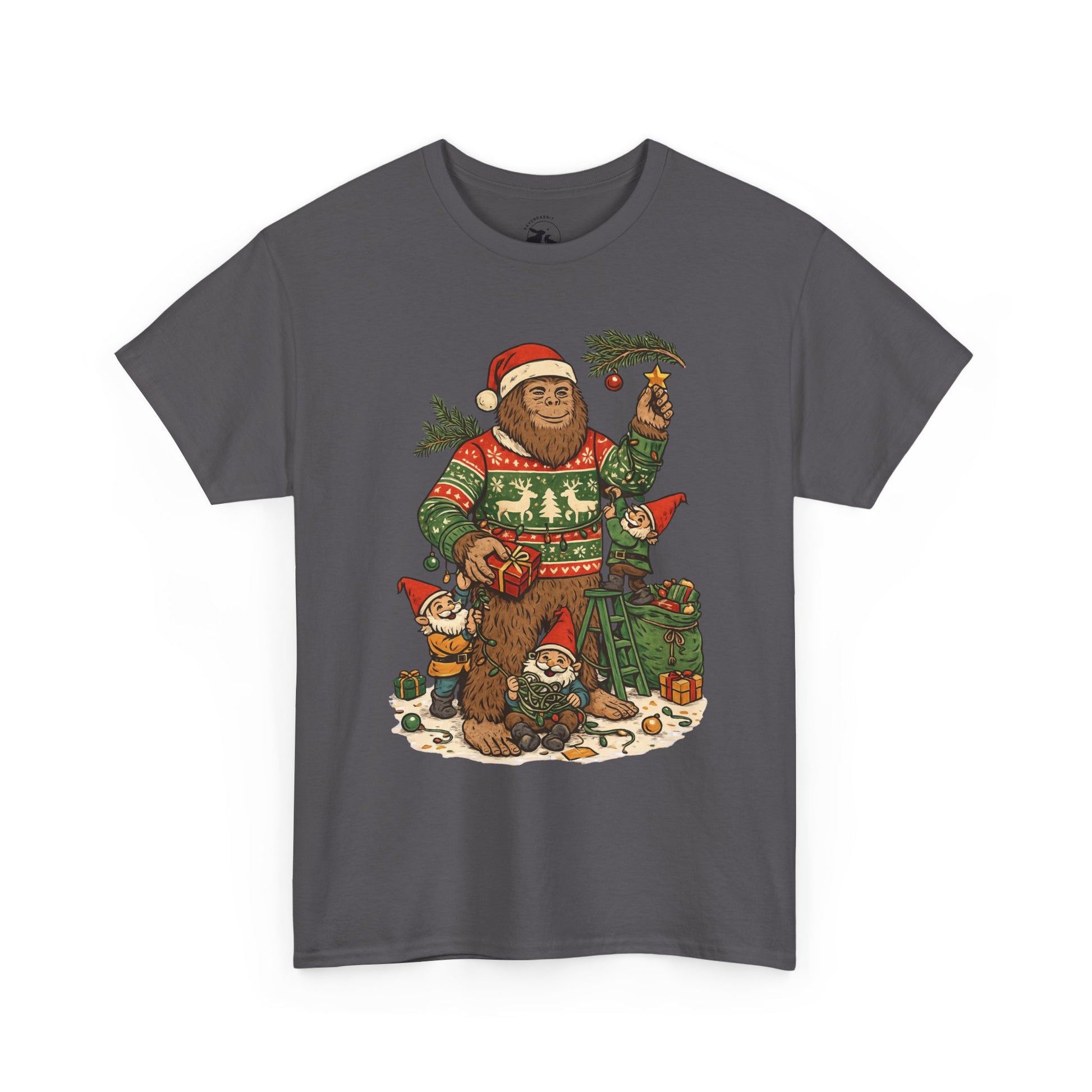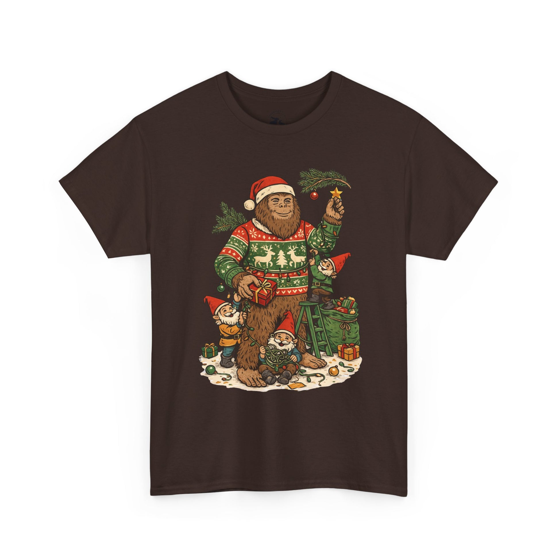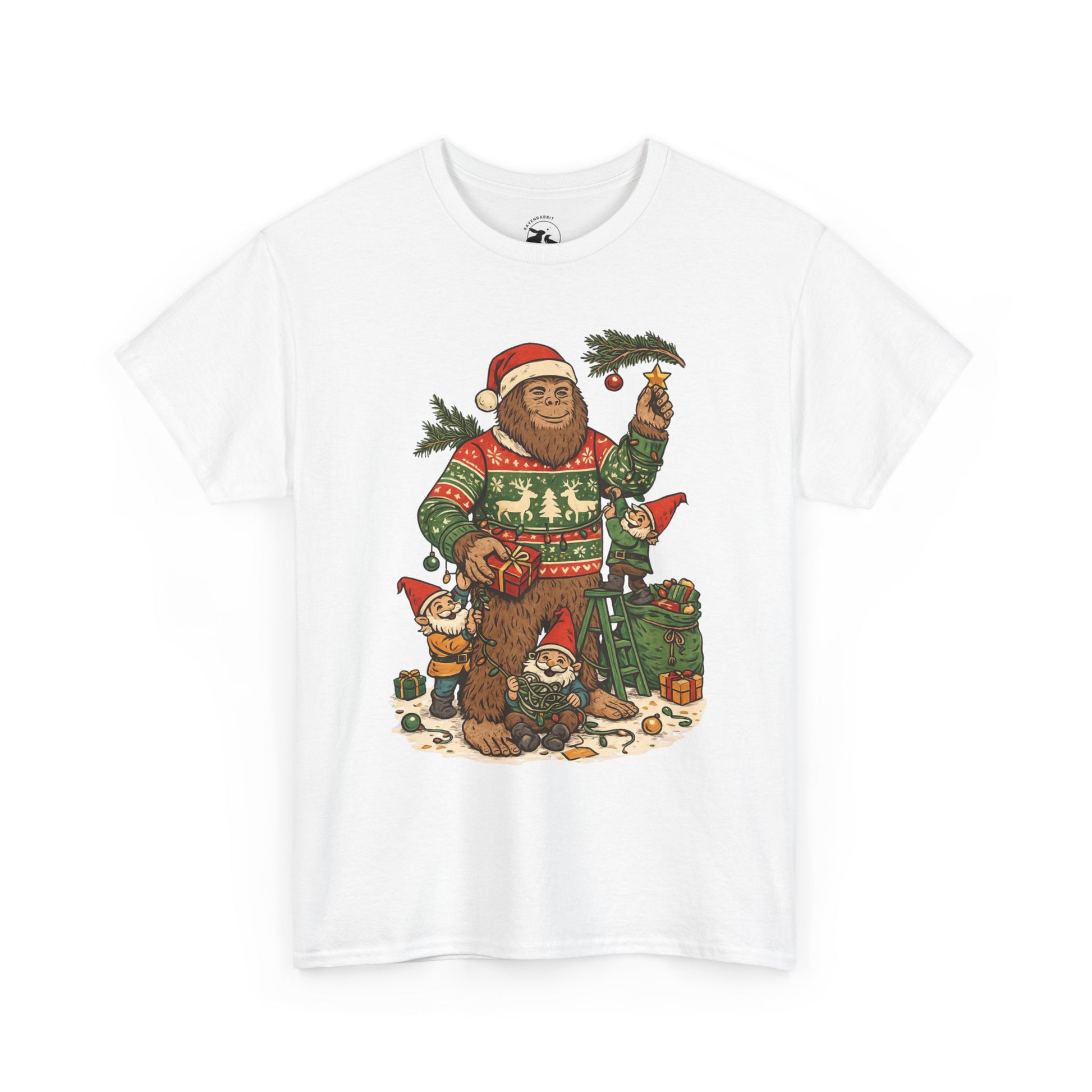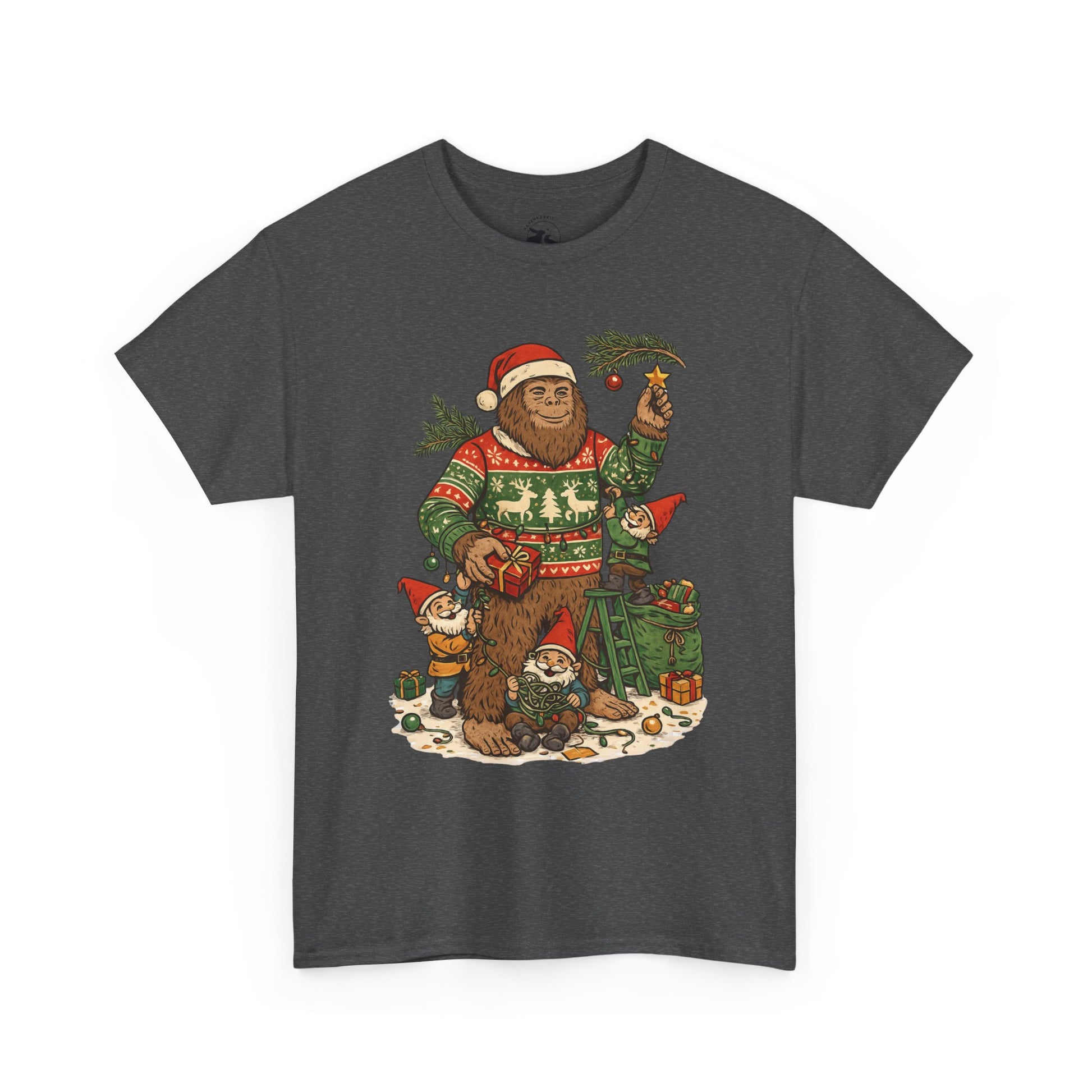 🎄 This Bigfoot And Gnome Holiday Helpers Tee celebrates the playful side of the season. Bigfoot stands in his cozy Christmas sweater while a team of cheerful gnomes untangle lights, pass presents, and help decorate with evergreen branches under winter magic.