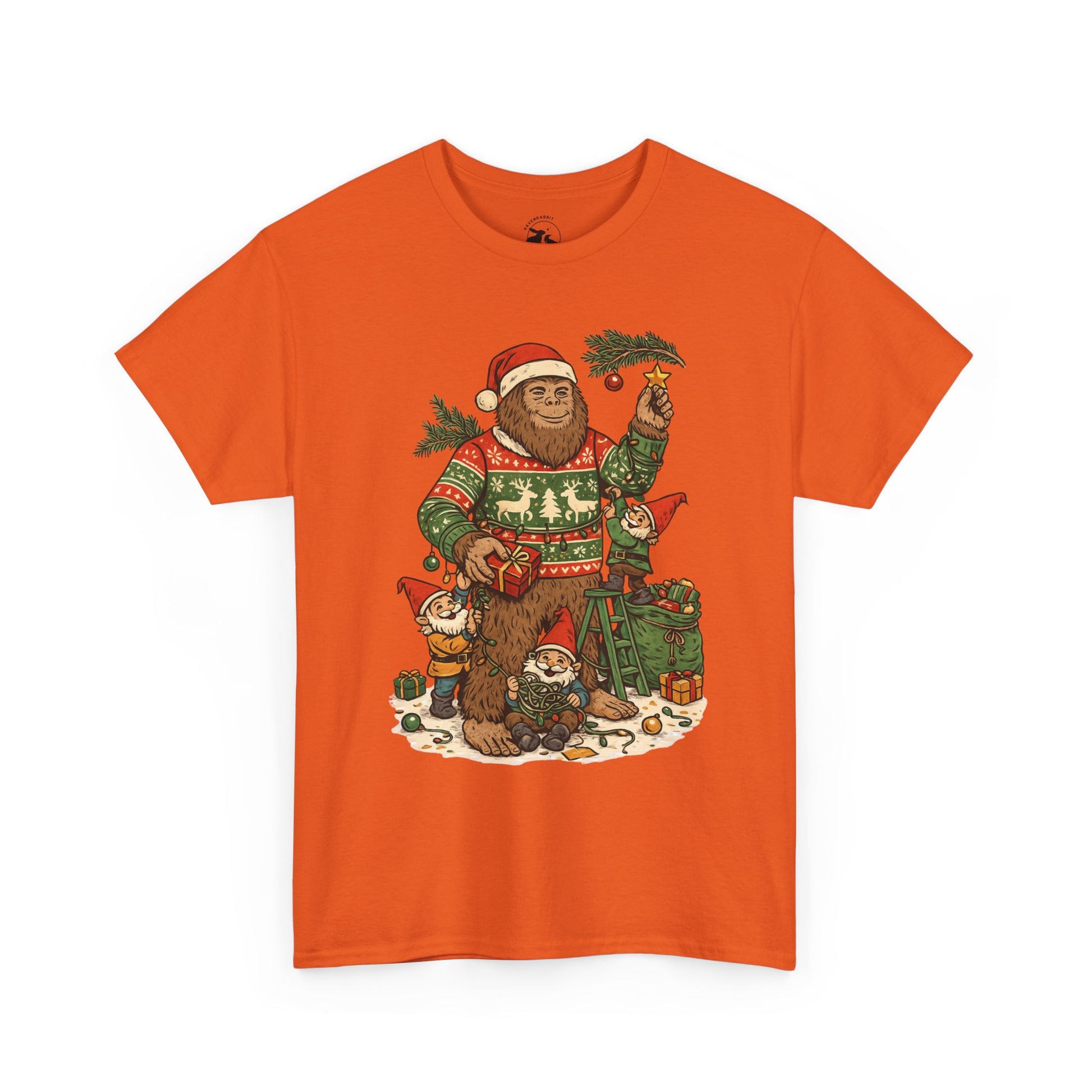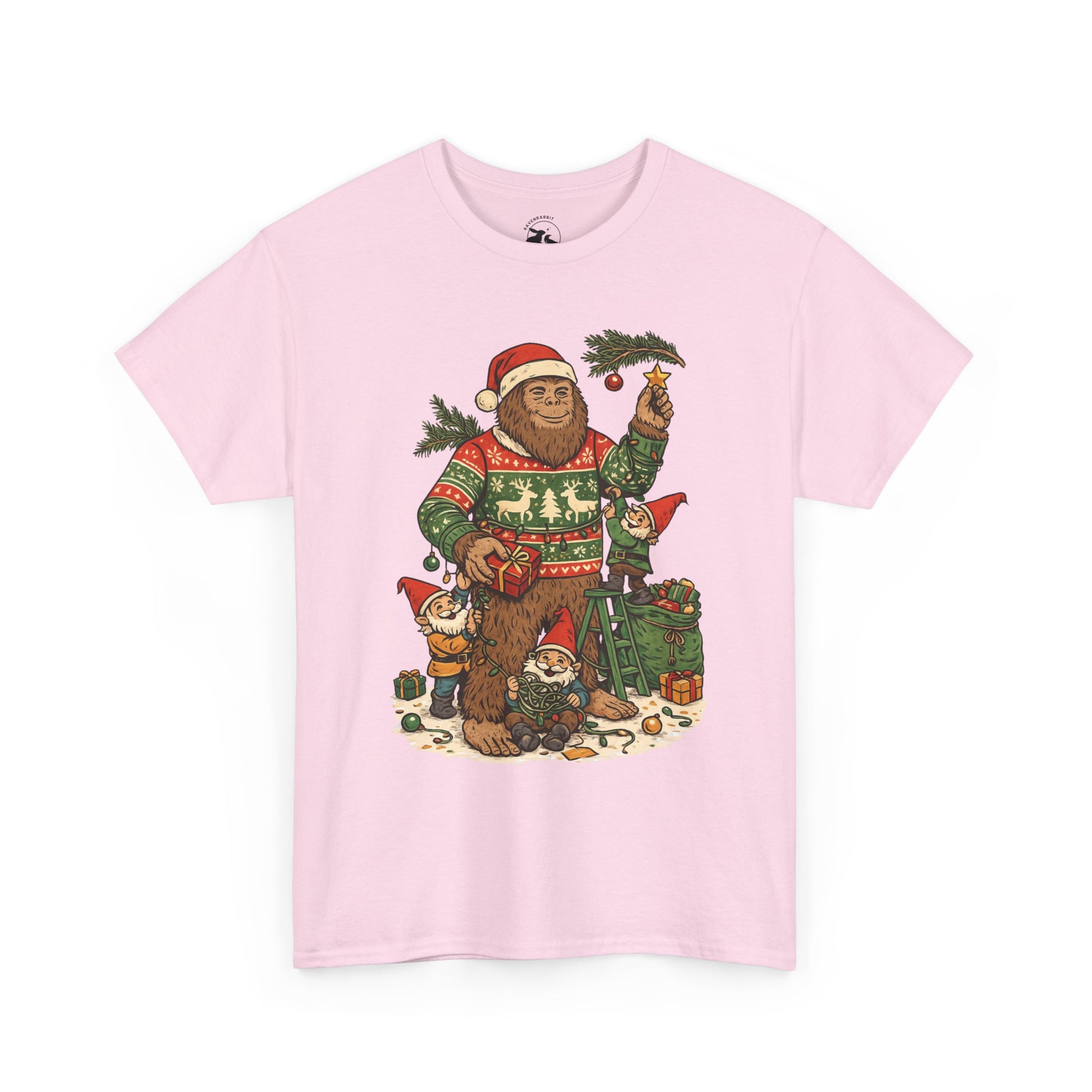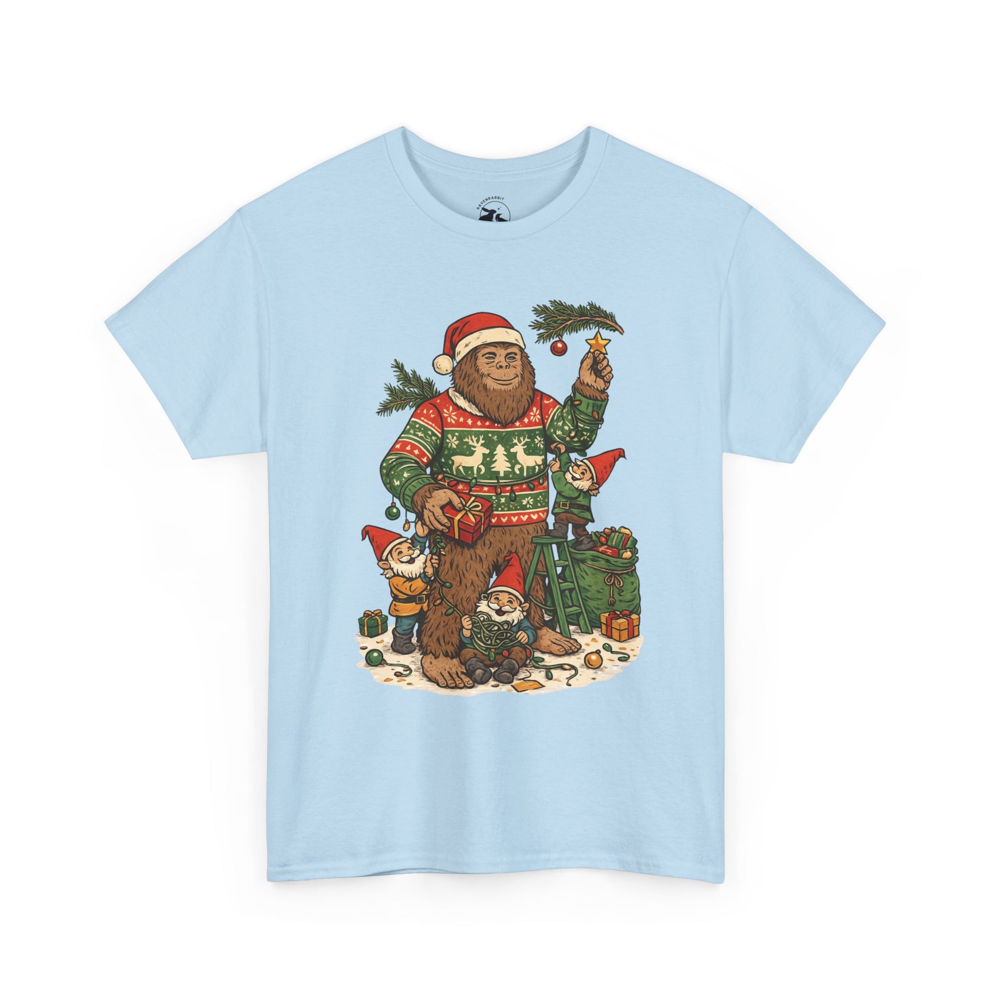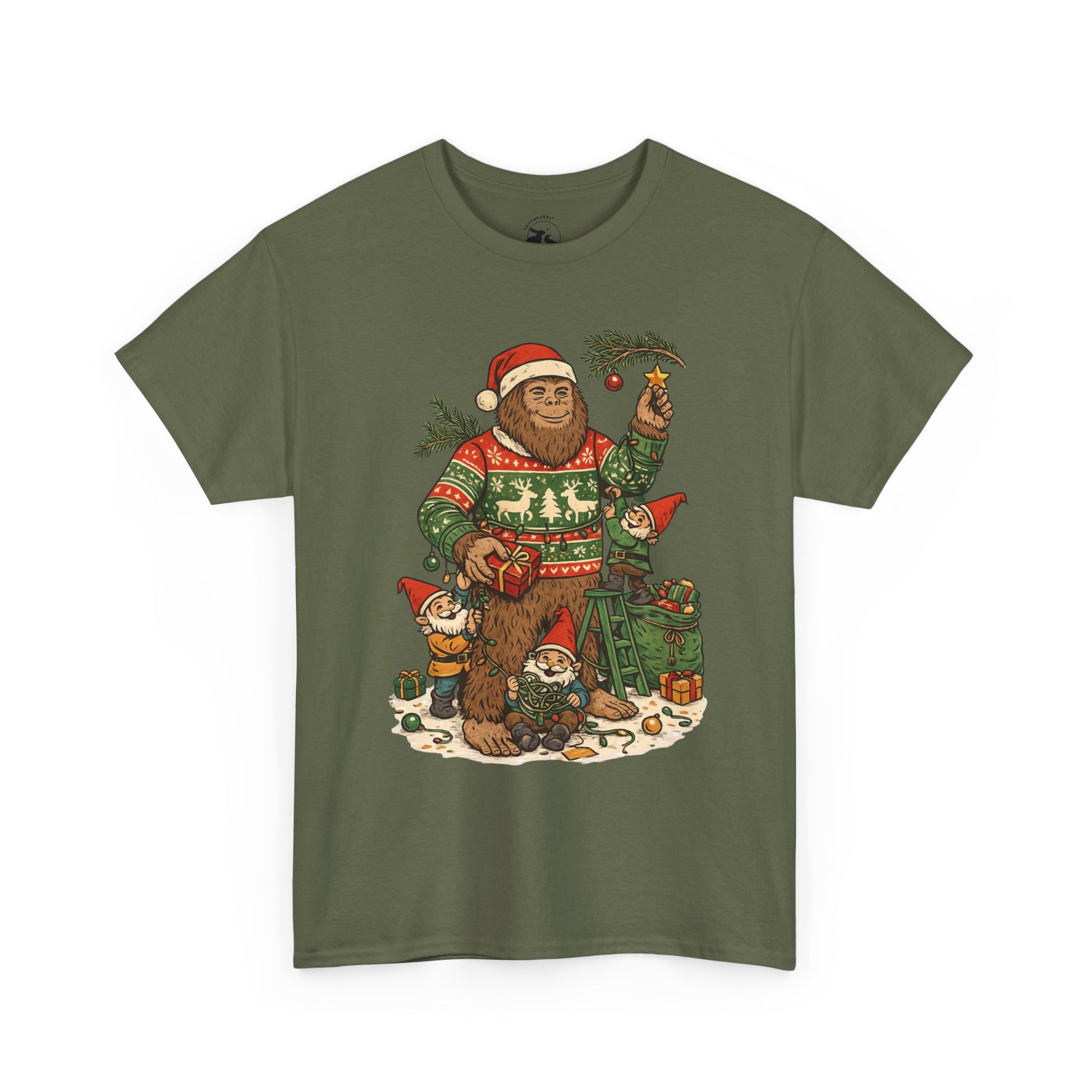 🎄 This Bigfoot And Gnome Holiday Helpers Tee celebrates the playful side of the season. Bigfoot stands in his cozy Christmas sweater while a team of cheerful gnomes untangle lights, pass presents, and help decorate with evergreen branches under winter magic.
