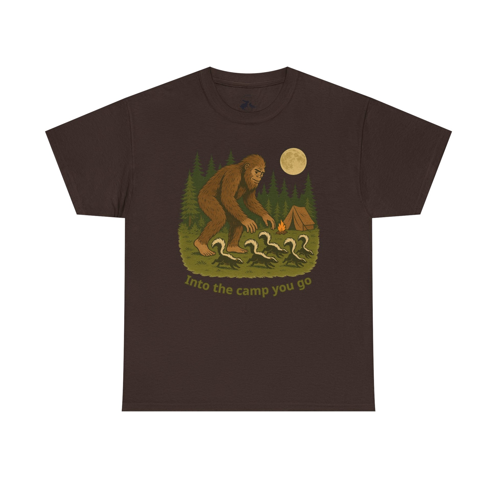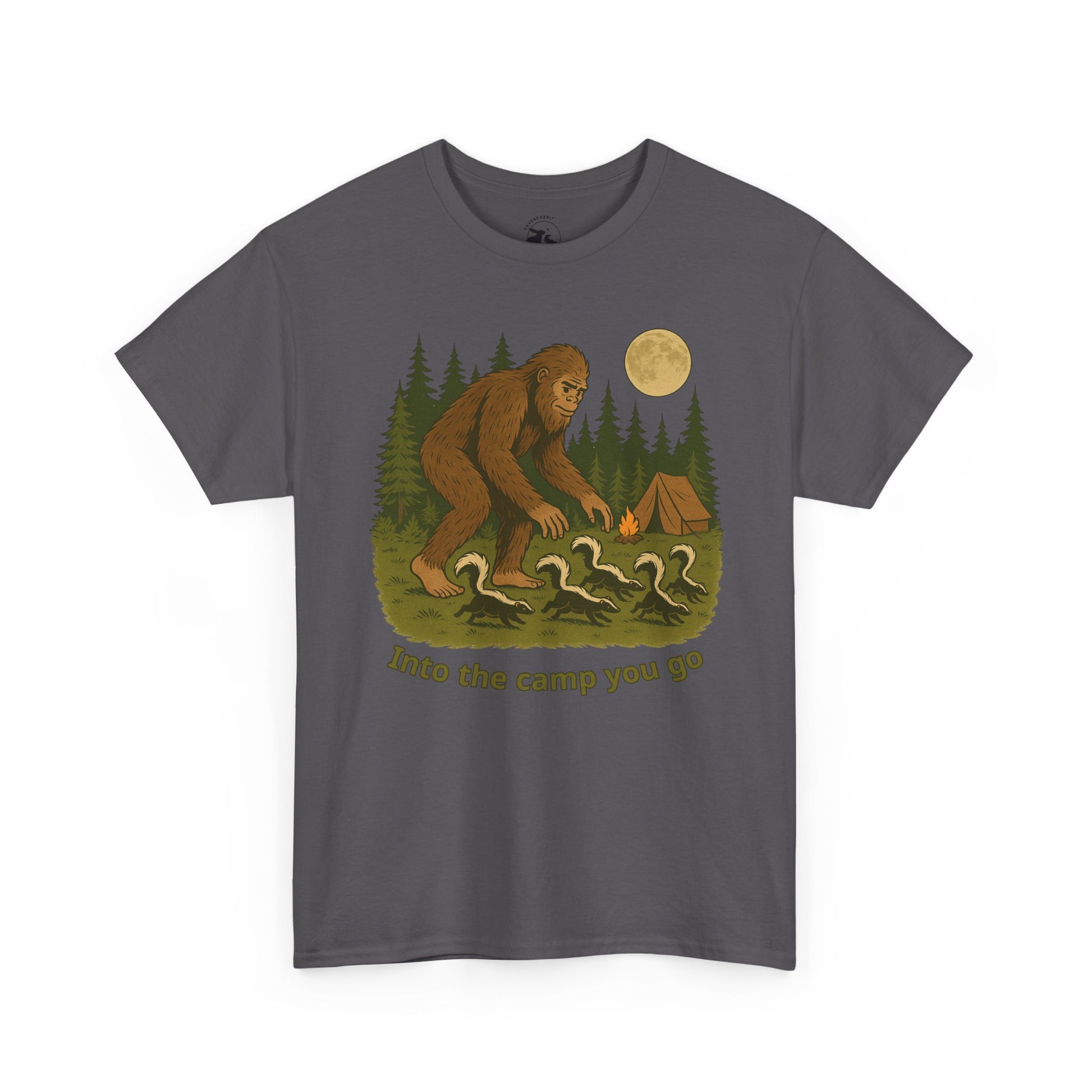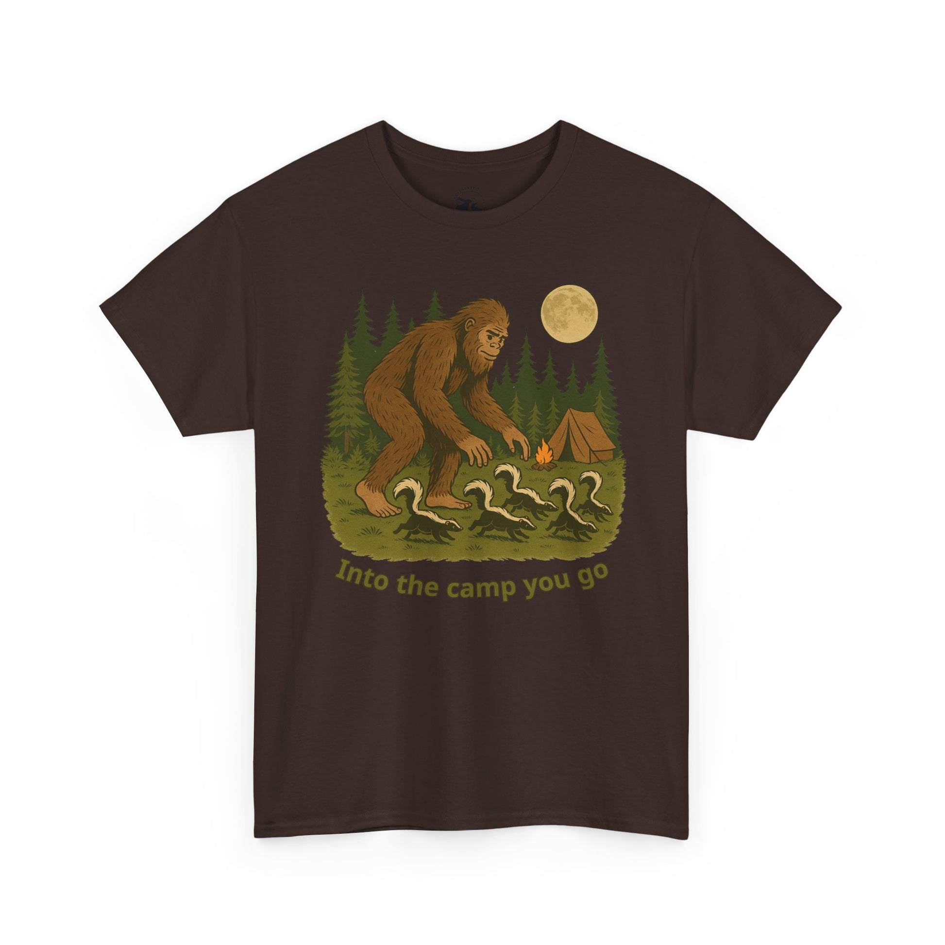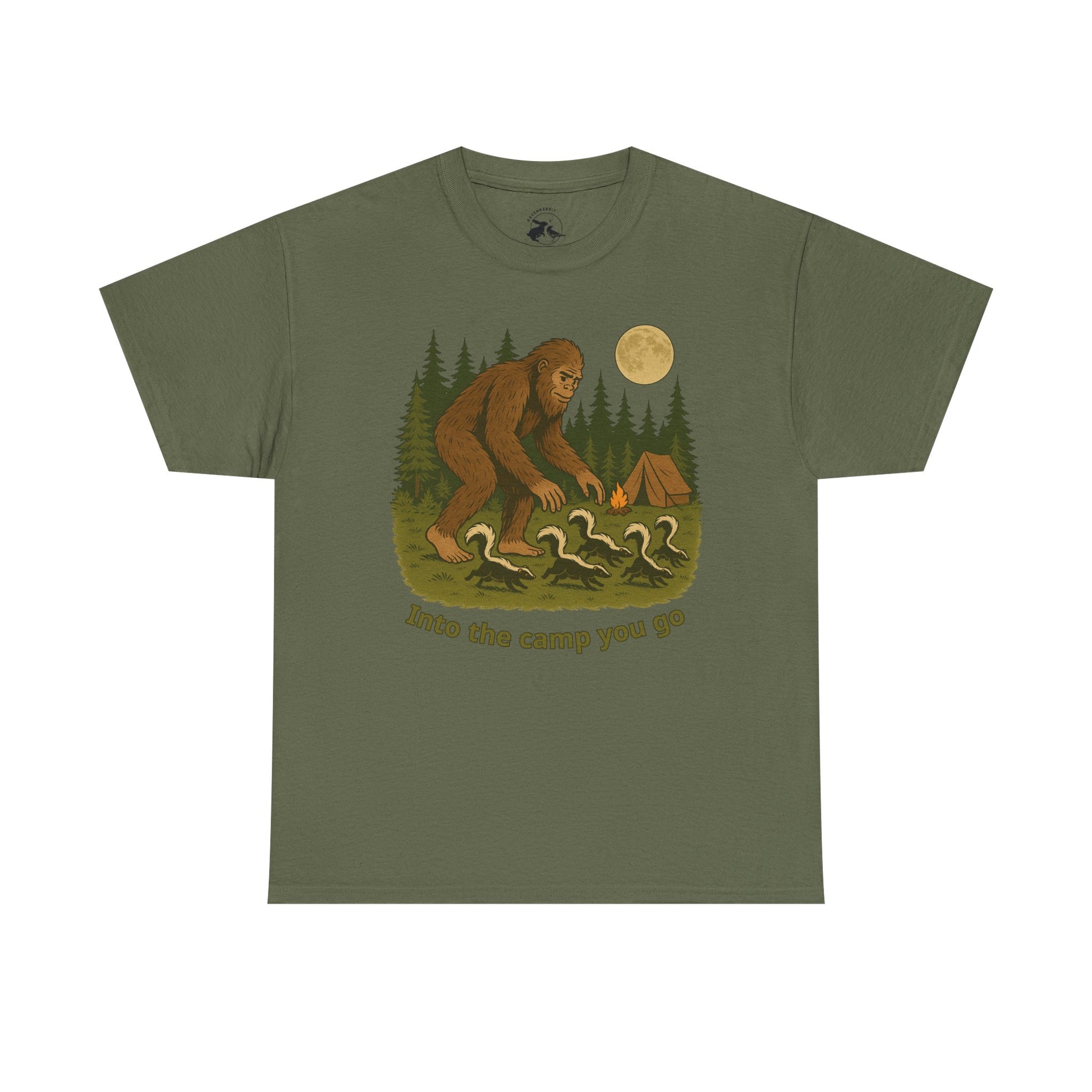 Bring some laughter to your wardrobe with this playful Bigfoot design. Inspired by campfire stories and late night adventures, this shirt features Bigfoot herding a mischievous group of skunks straight into a campsite under the glow of a full moon. The vintage style illustration captures both the humor and mystery of the wilderness, making it a perfect choice for campers, adventurers, and cryptid fans alike. Whether you love Sasquatch lore, enjoy clever outdoor humor, or just want a conversation starter, this tee is designed to stand out on any adventure.
