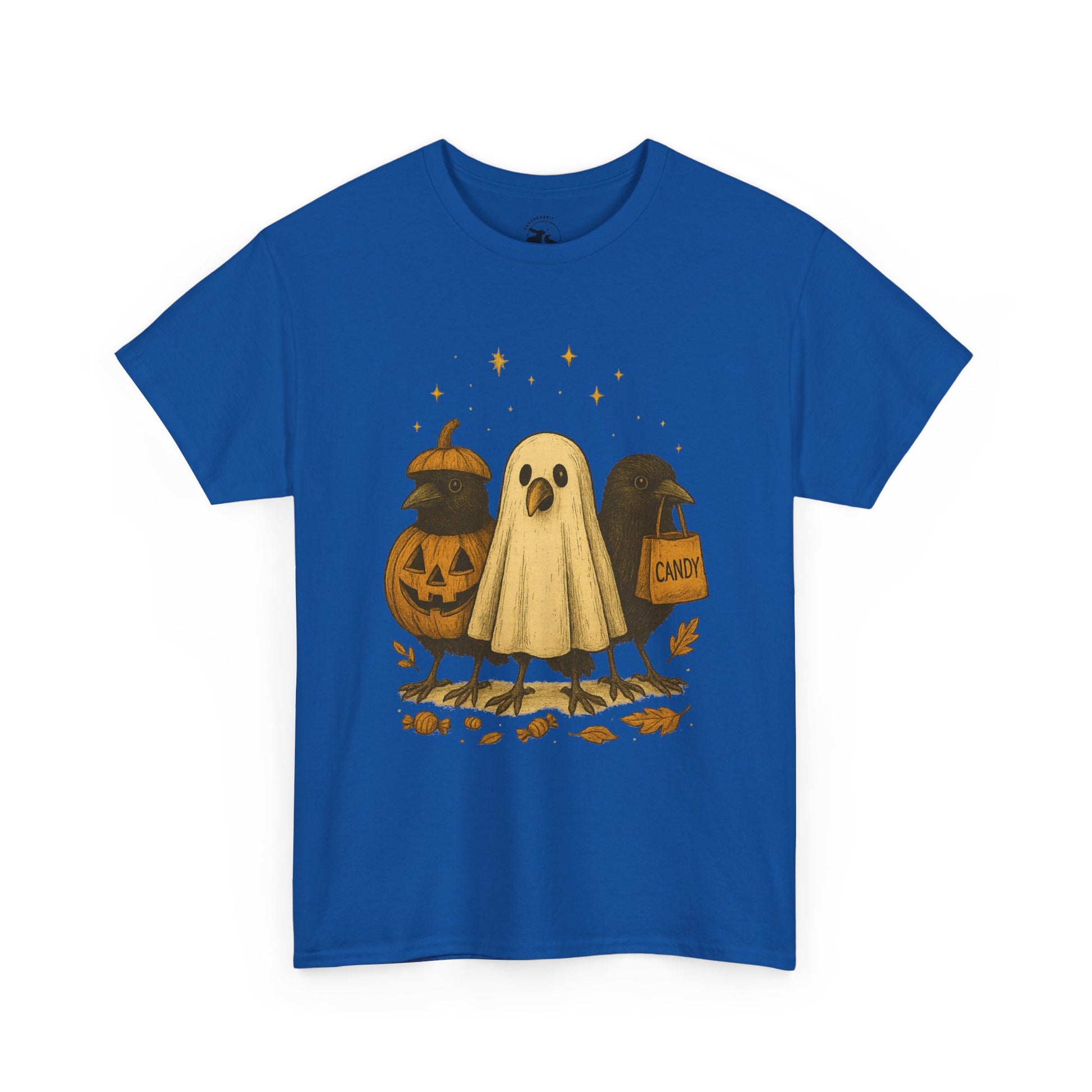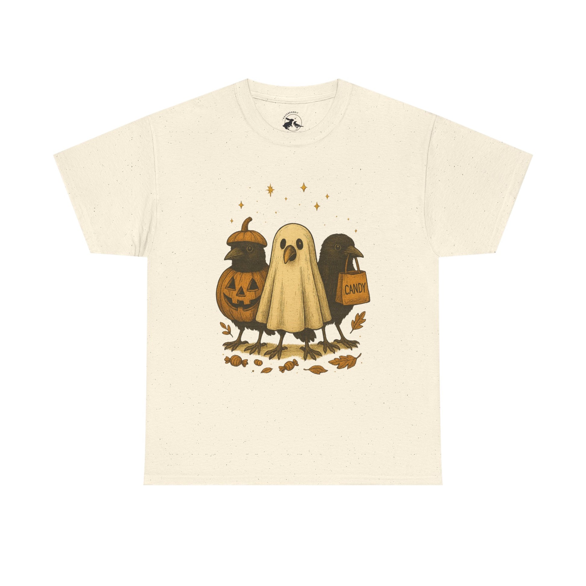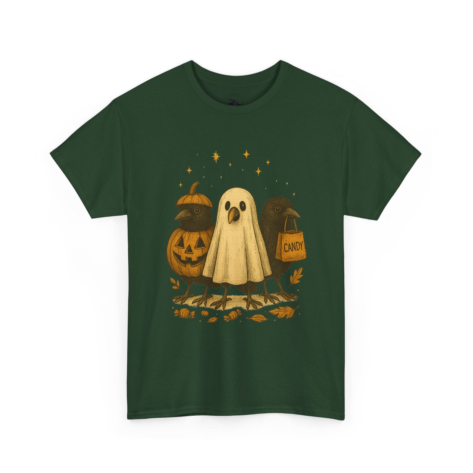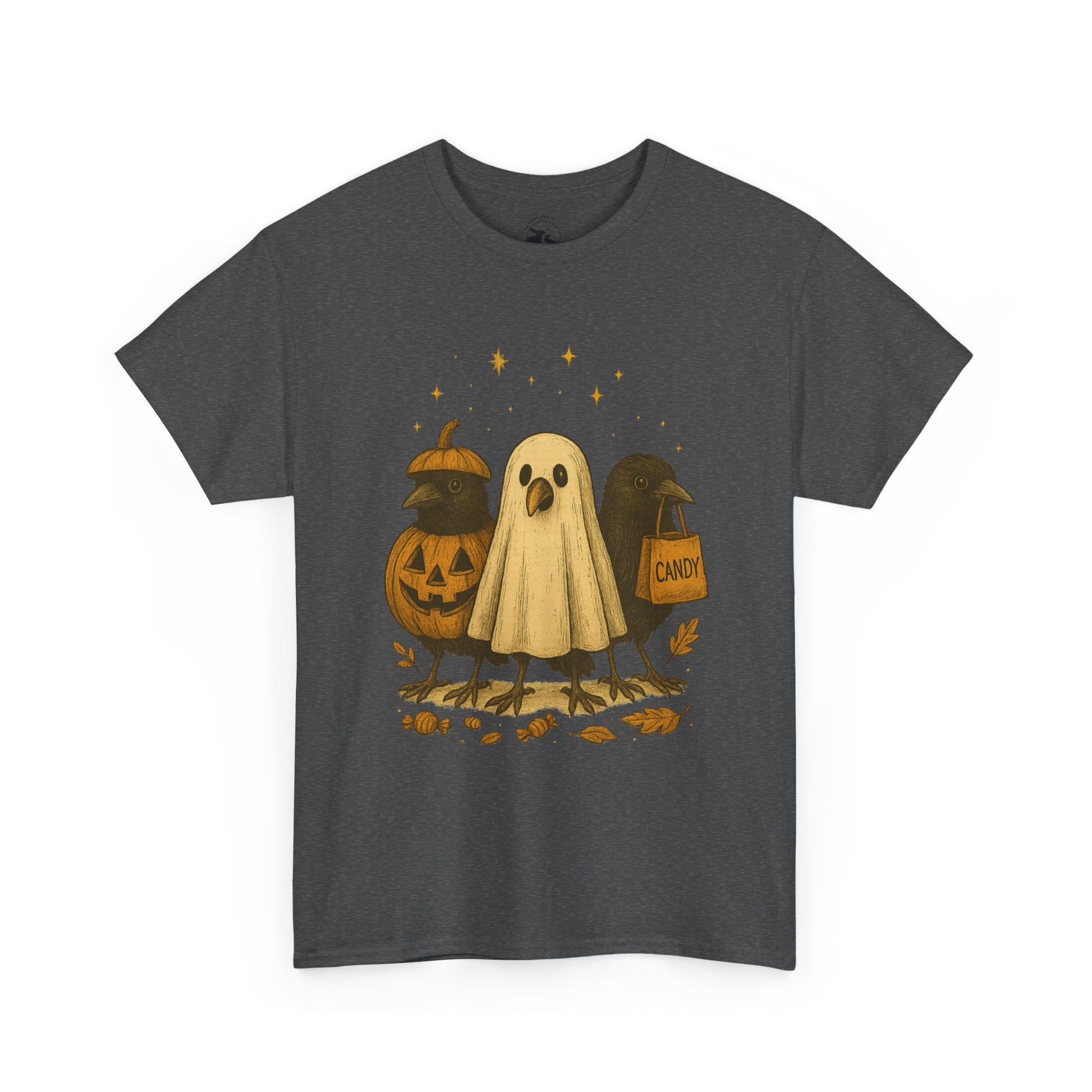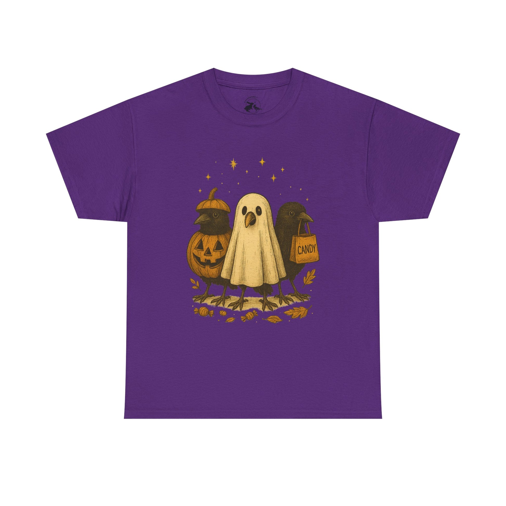 Our Ravens After Dark Tee features three mischievous ravens ready for a night of trick-or-treating — one dressed as a glowing jack-o’-lantern, one in a ghostly sheet, and one proudly holding a candy bag under a sky full of stars. 🍬🌙