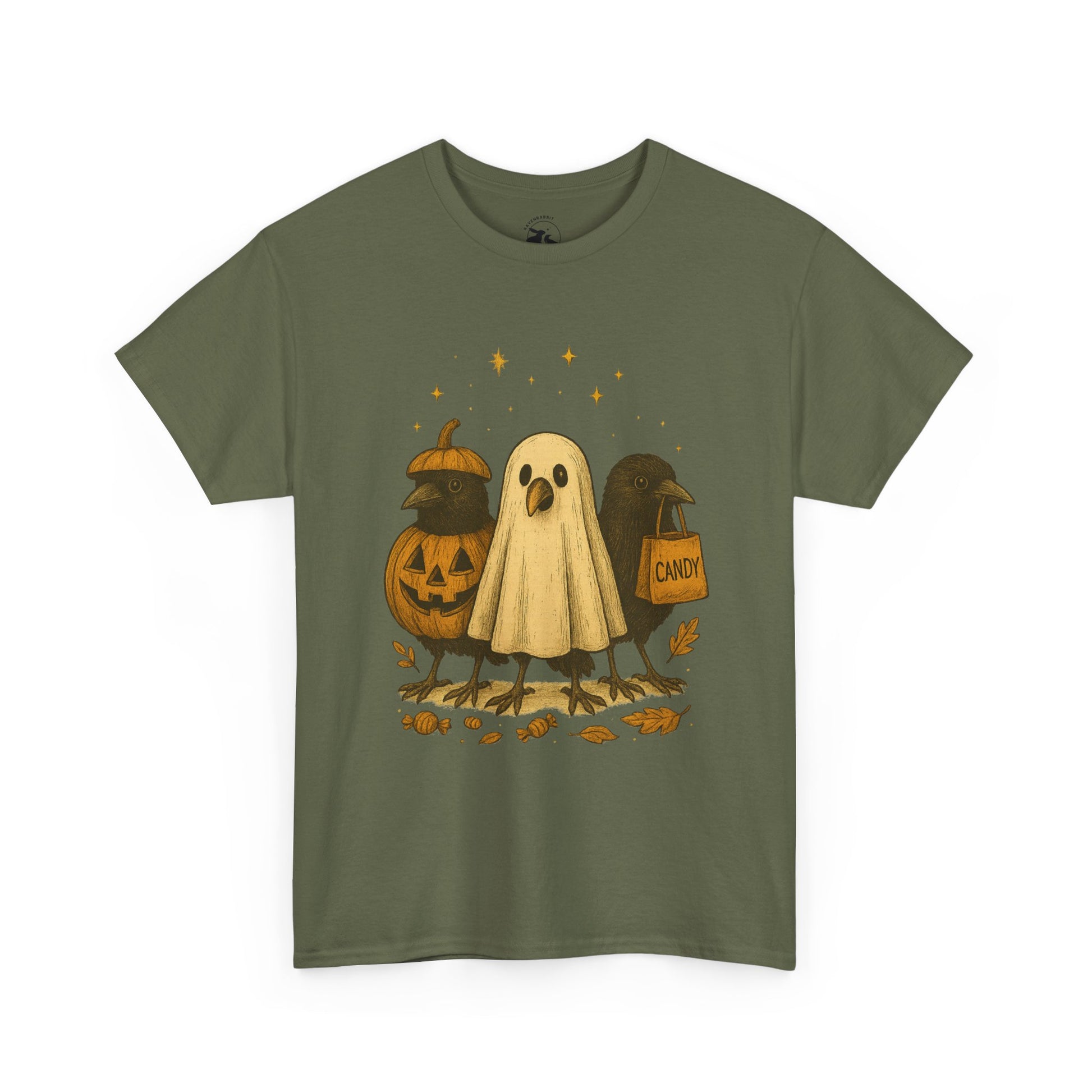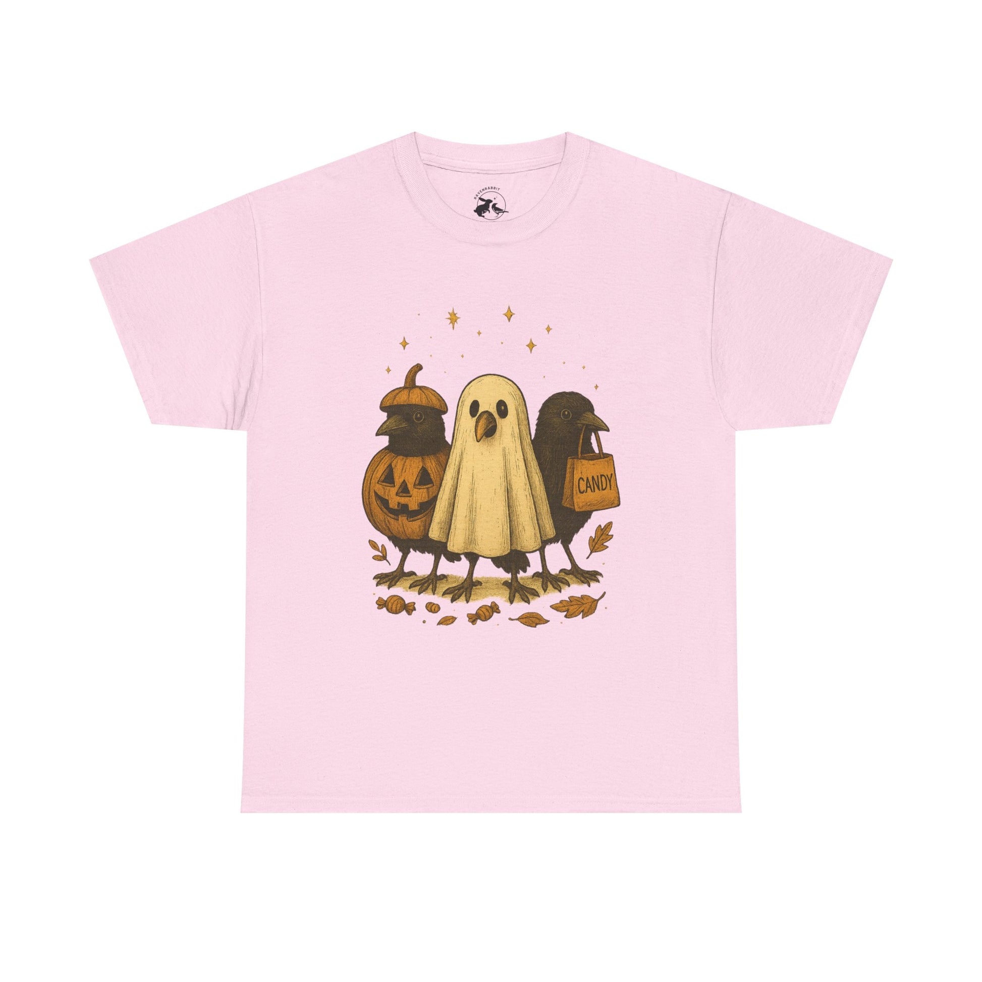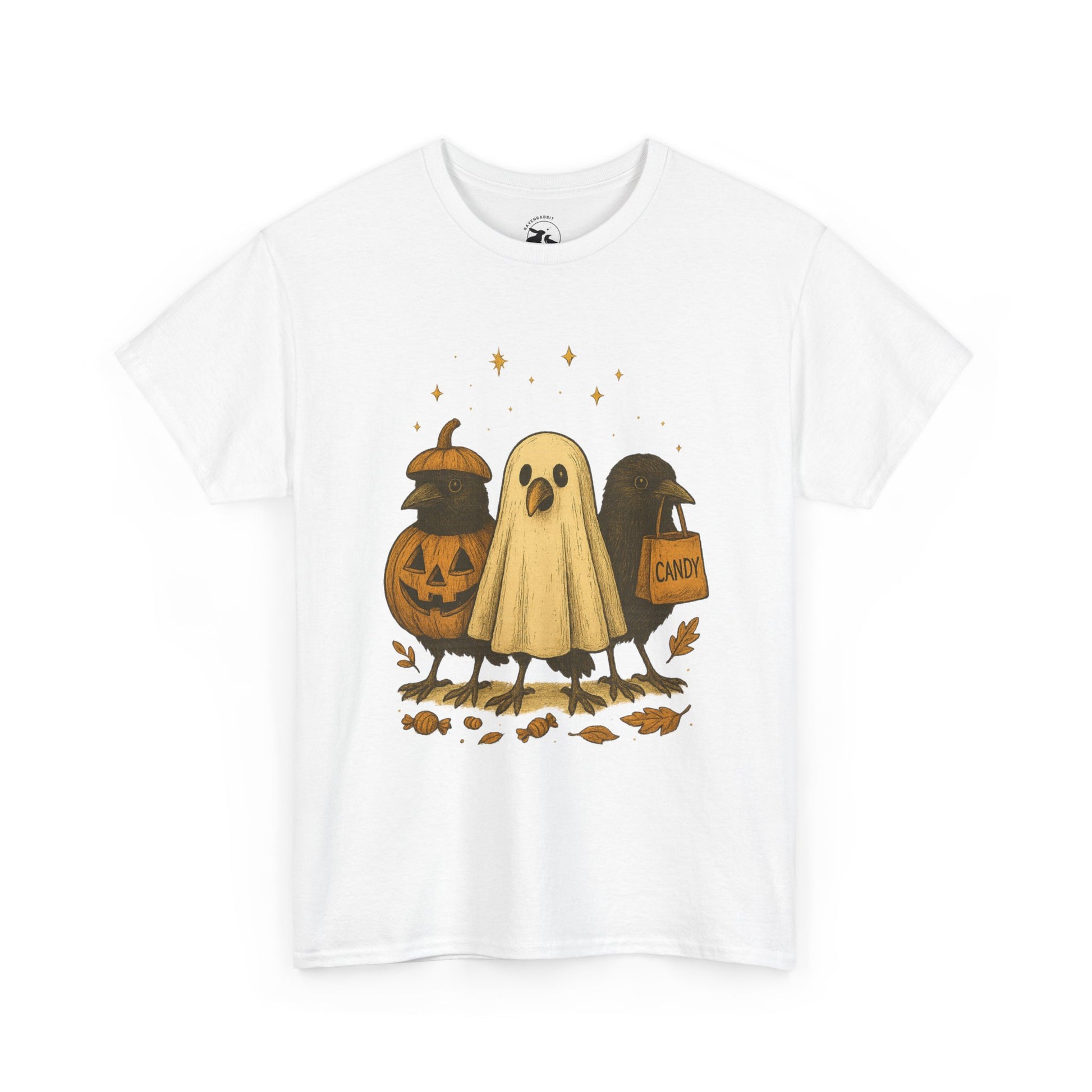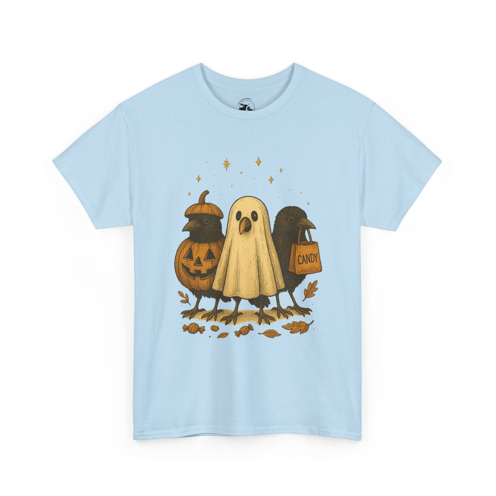 Our Ravens After Dark Tee features three mischievous ravens ready for a night of trick-or-treating — one dressed as a glowing jack-o’-lantern, one in a ghostly sheet, and one proudly holding a candy bag under a sky full of stars. 🍬🌙