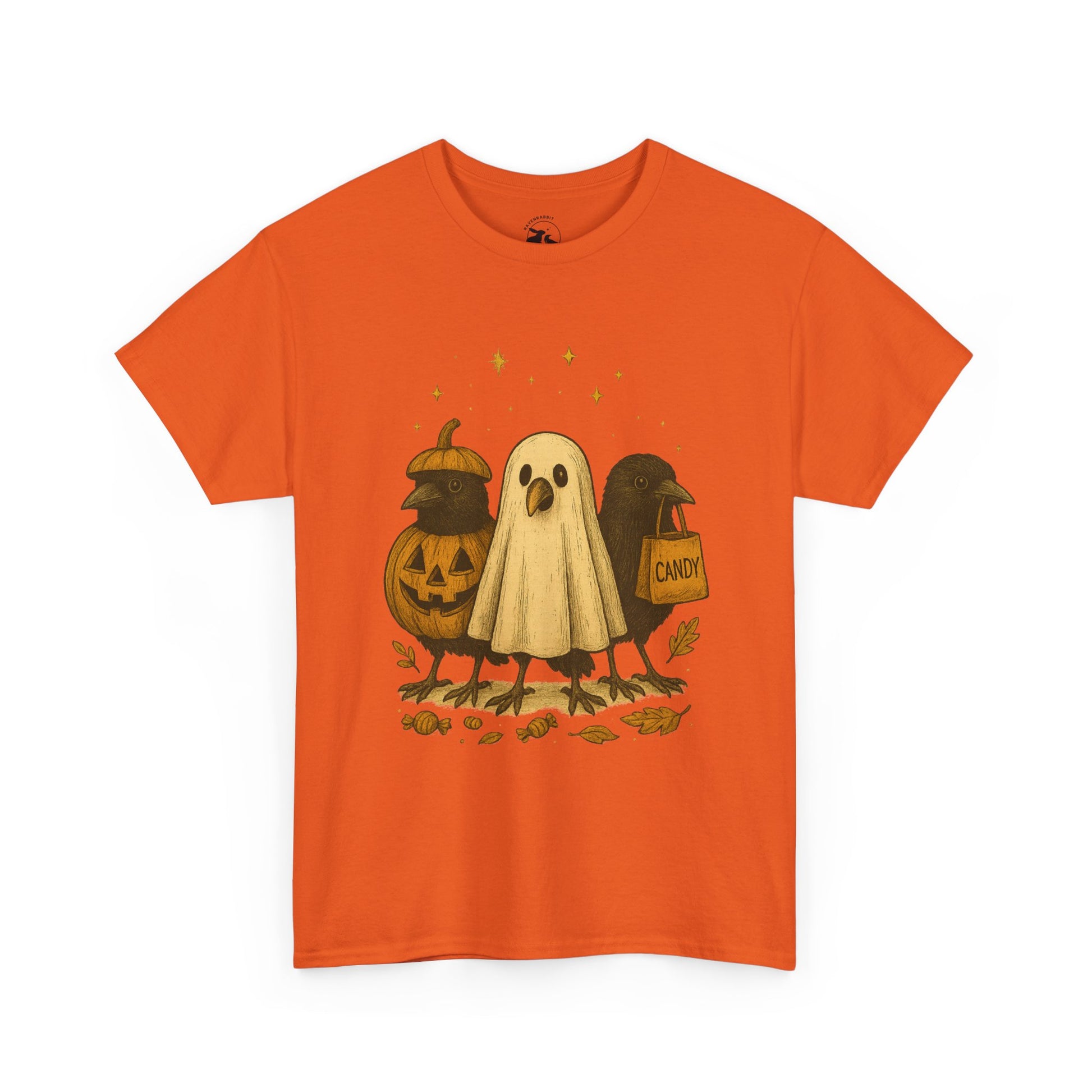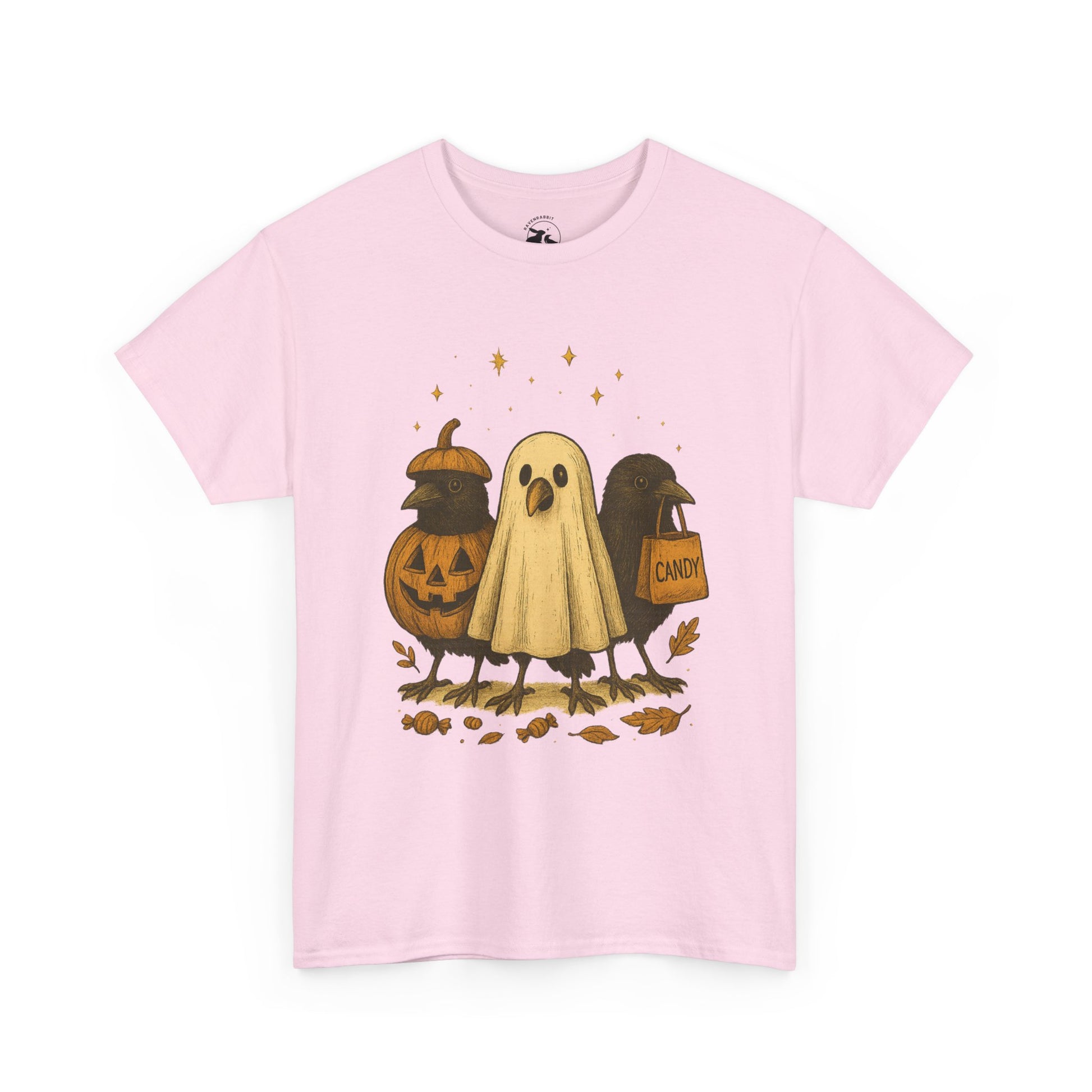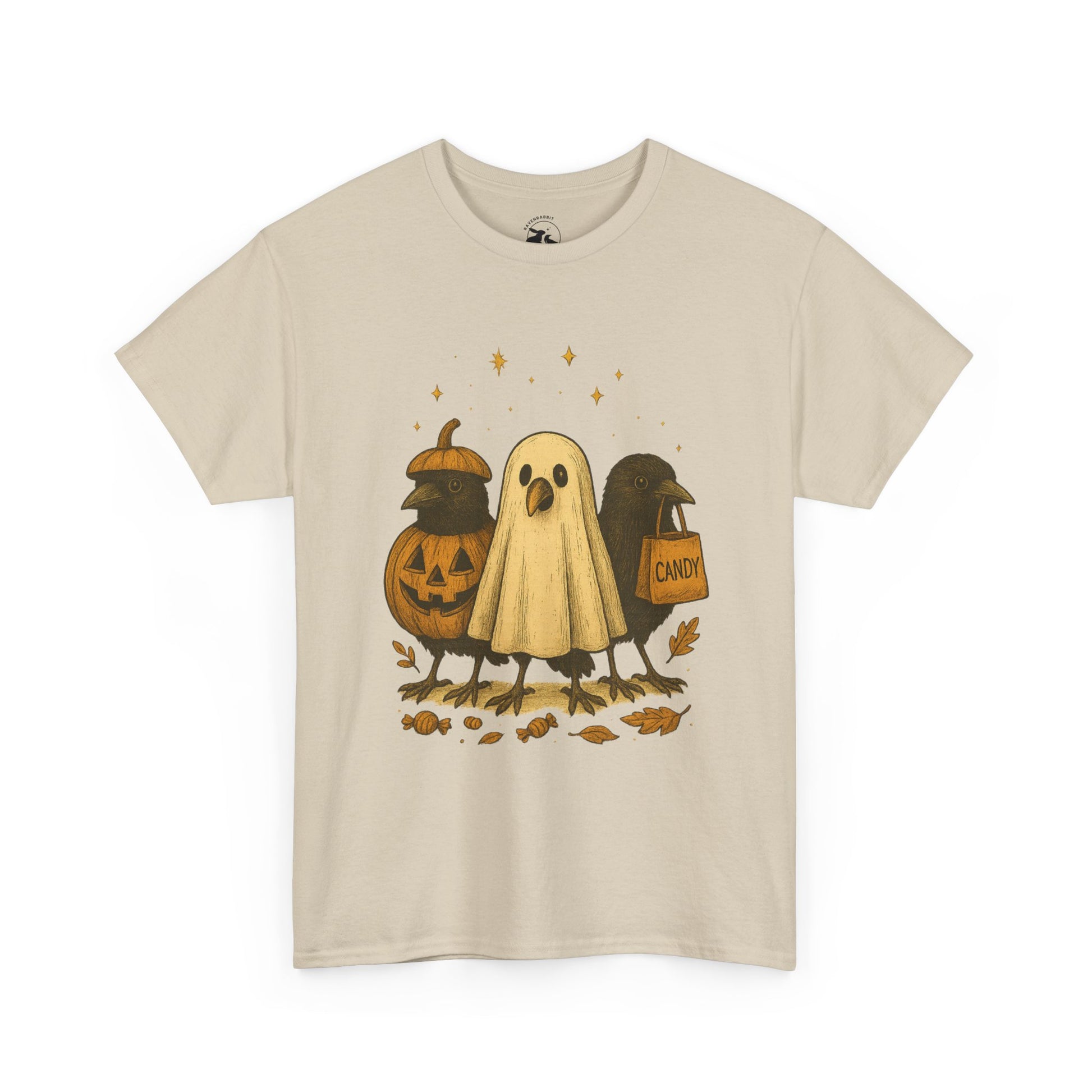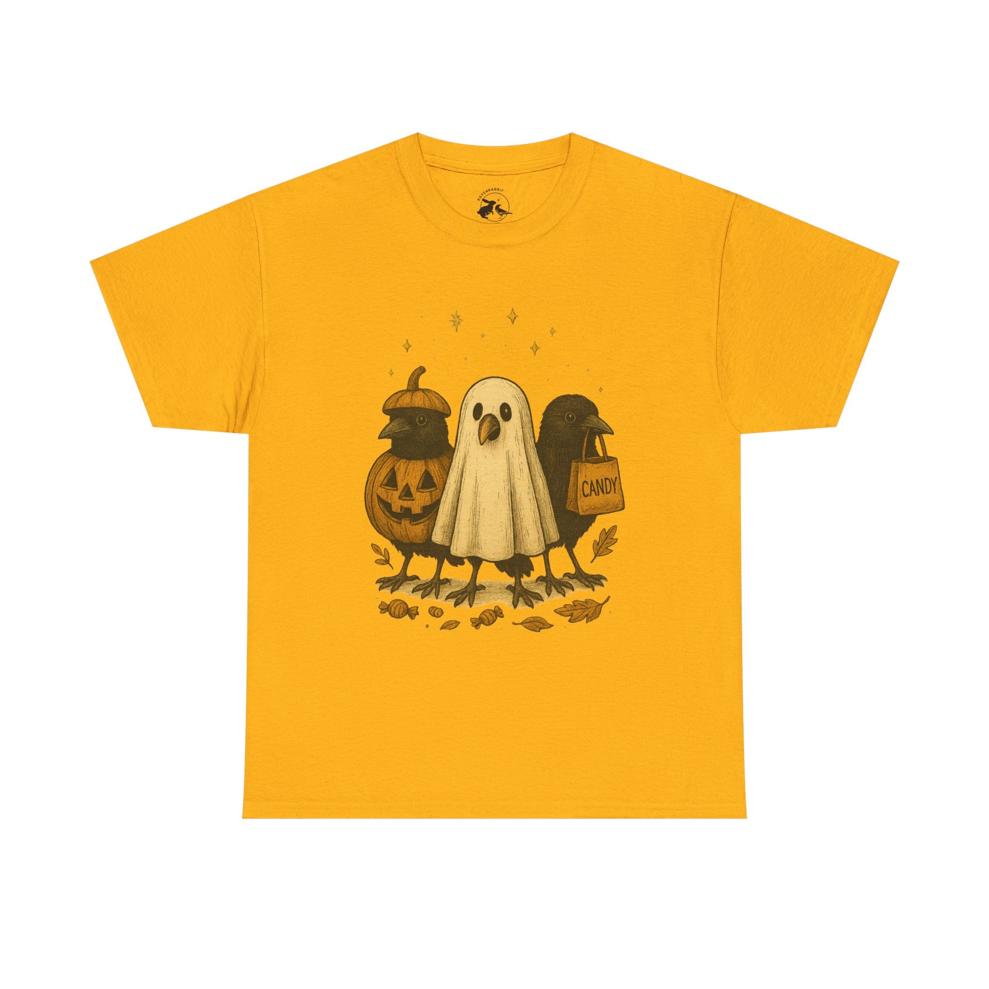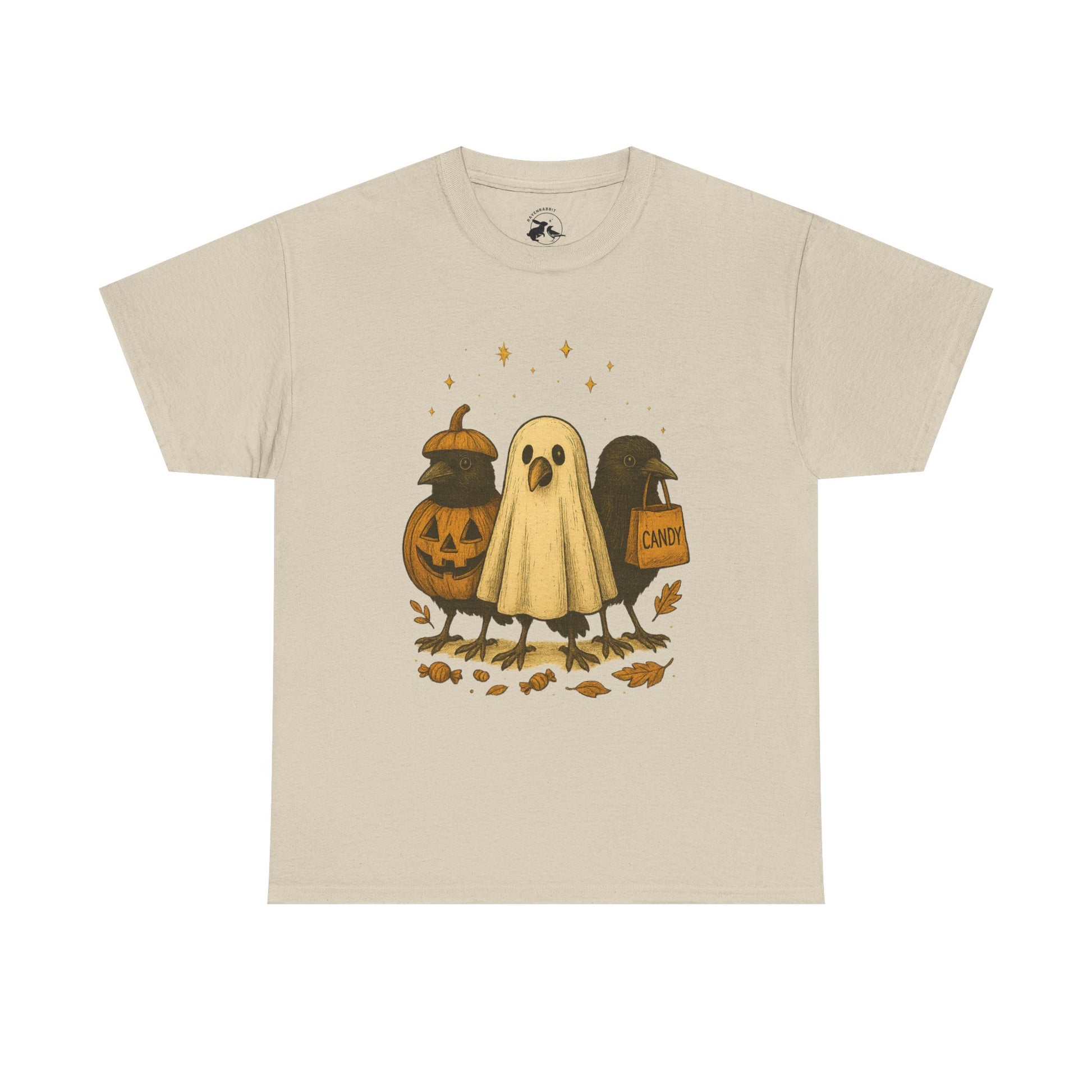 Our Ravens After Dark Tee features three mischievous ravens ready for a night of trick-or-treating — one dressed as a glowing jack-o’-lantern, one in a ghostly sheet, and one proudly holding a candy bag under a sky full of stars. 🍬🌙