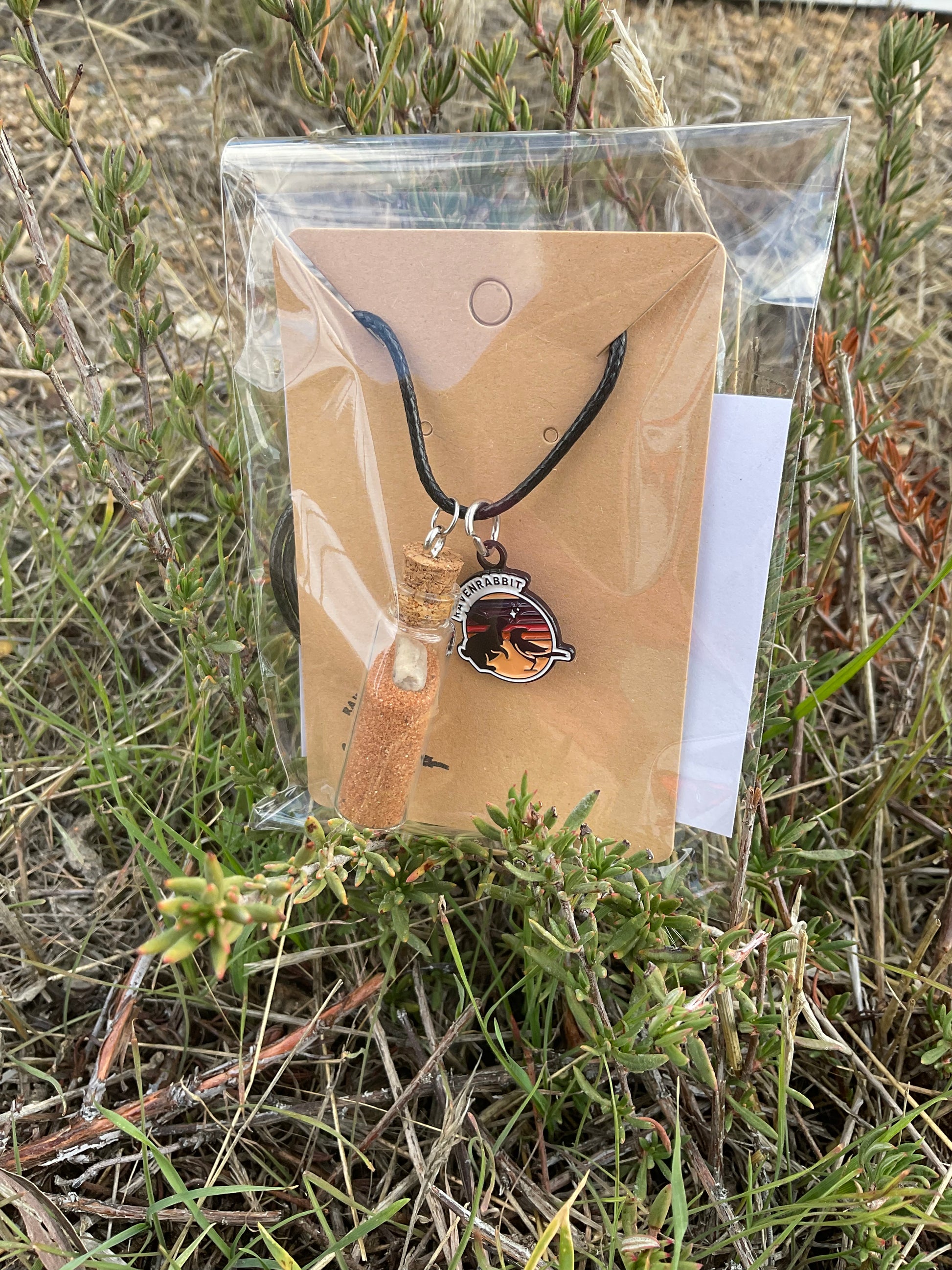 Encased in a vial of sacred energy, the sand is paired with a unique crystal chosen to amplify harmony, grounding, and protection. The signature RavenRabbit charm accompanies each piece symbolizing connection between past, present, and future. 🪶✨