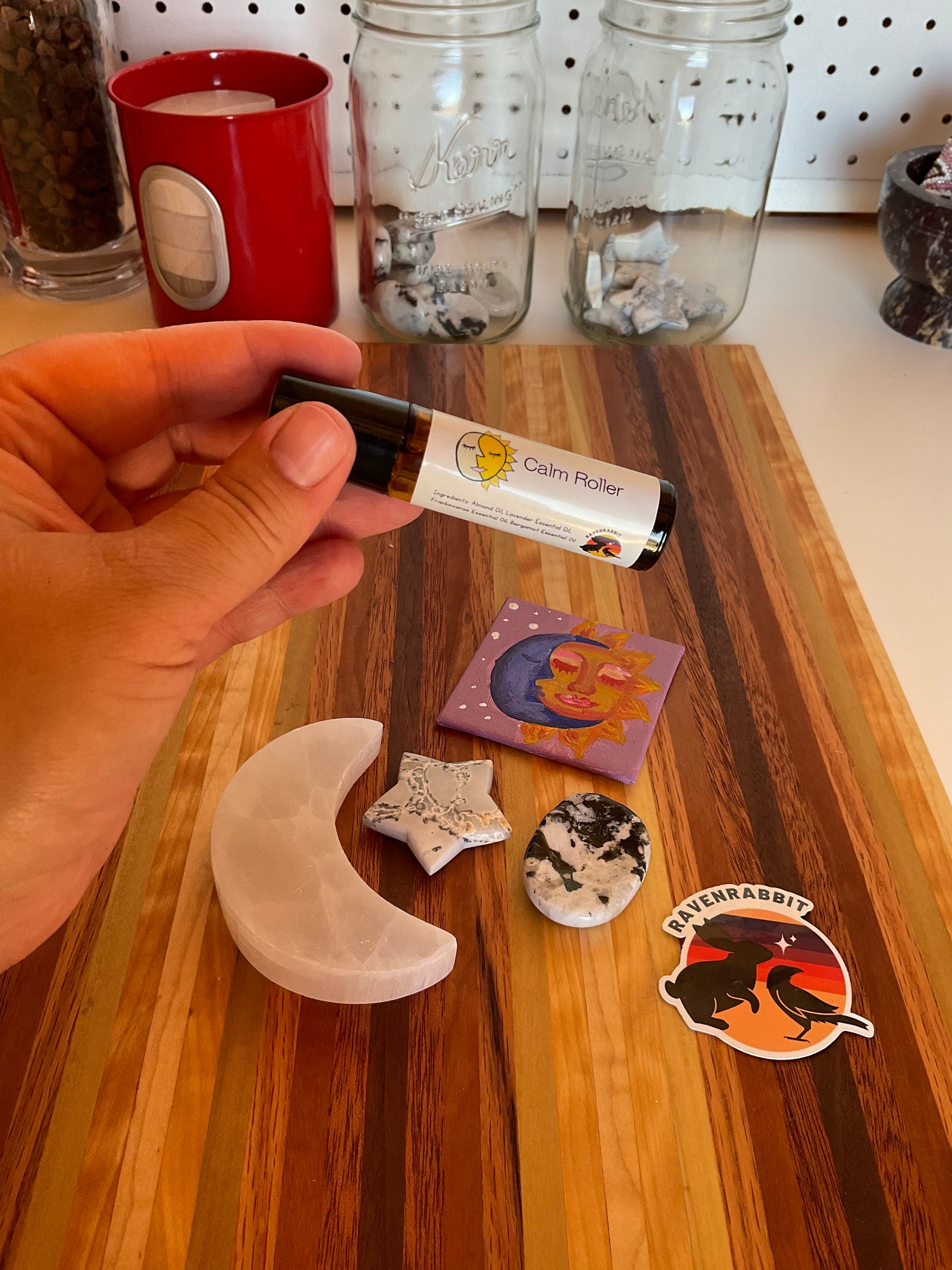 • Calm Roller – A grounding blend of essential oils crafted to bring serenity and emotional release. Roll onto your wrists, neck, or heart center whenever you need to quiet your thoughts and return to a place of peace. 🌸