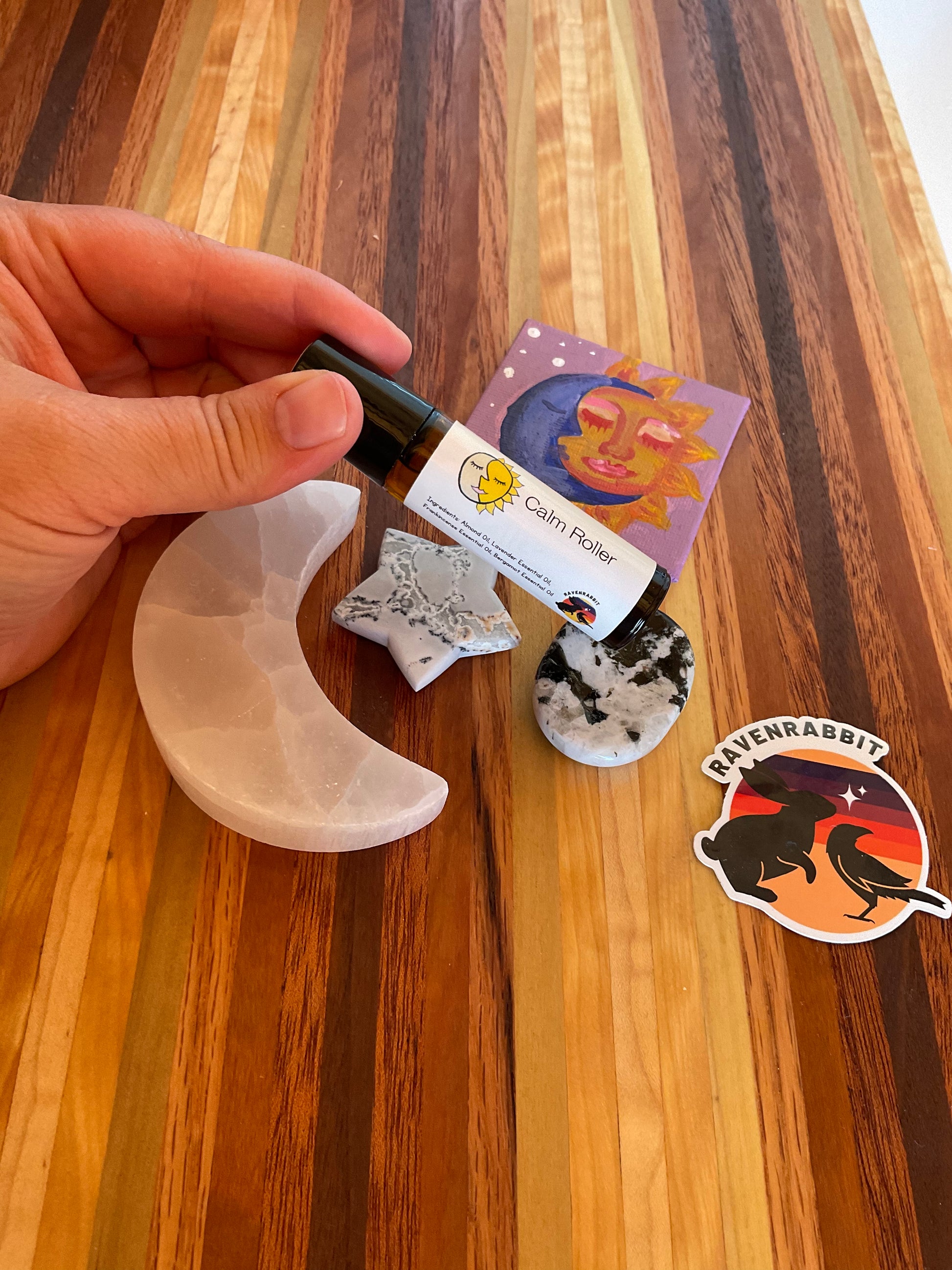 • Includes Moonstone, Calm Roller, Sun & Moon Painting, Moon-Shaped Selenite, and Star Stone