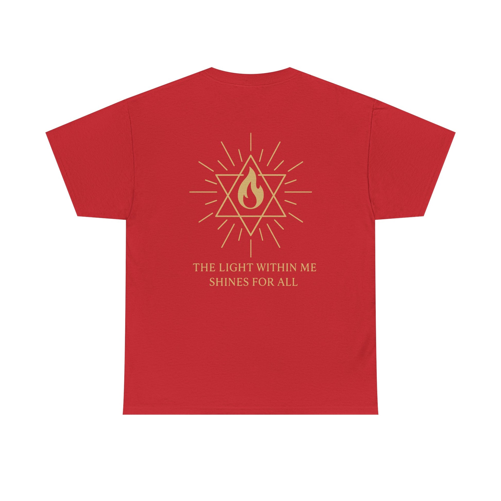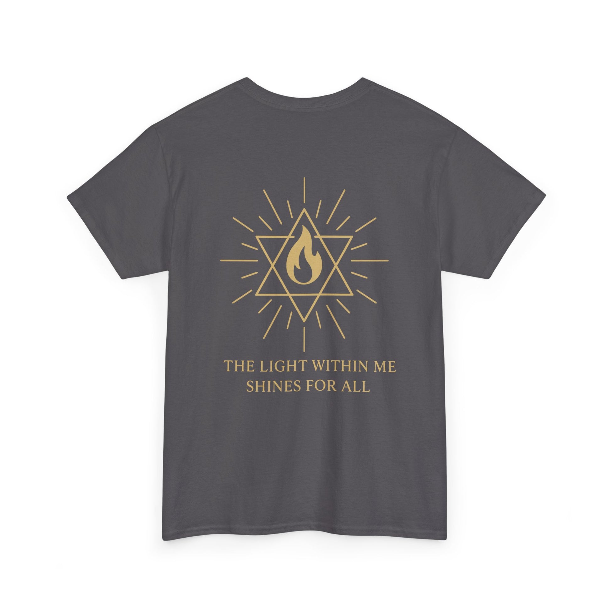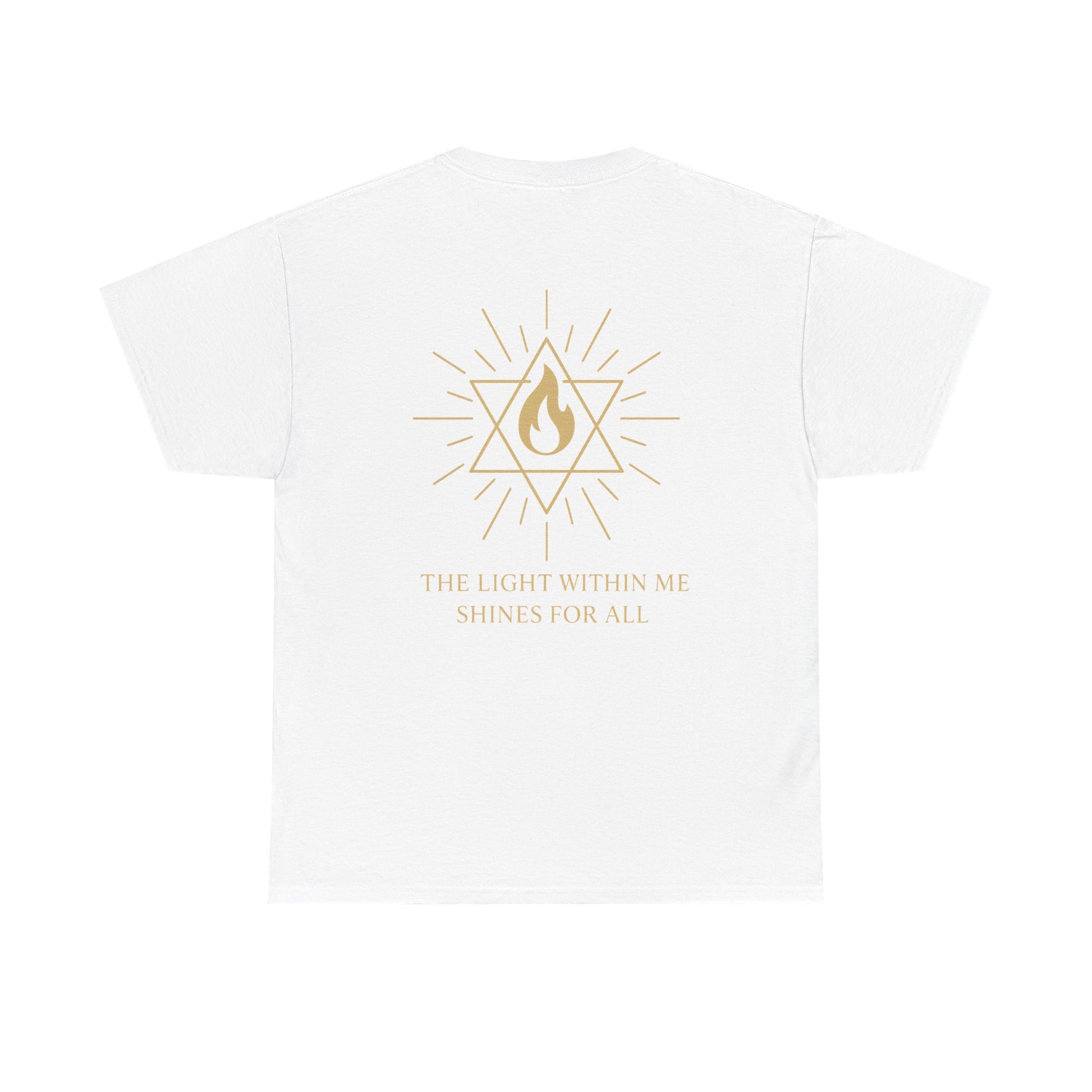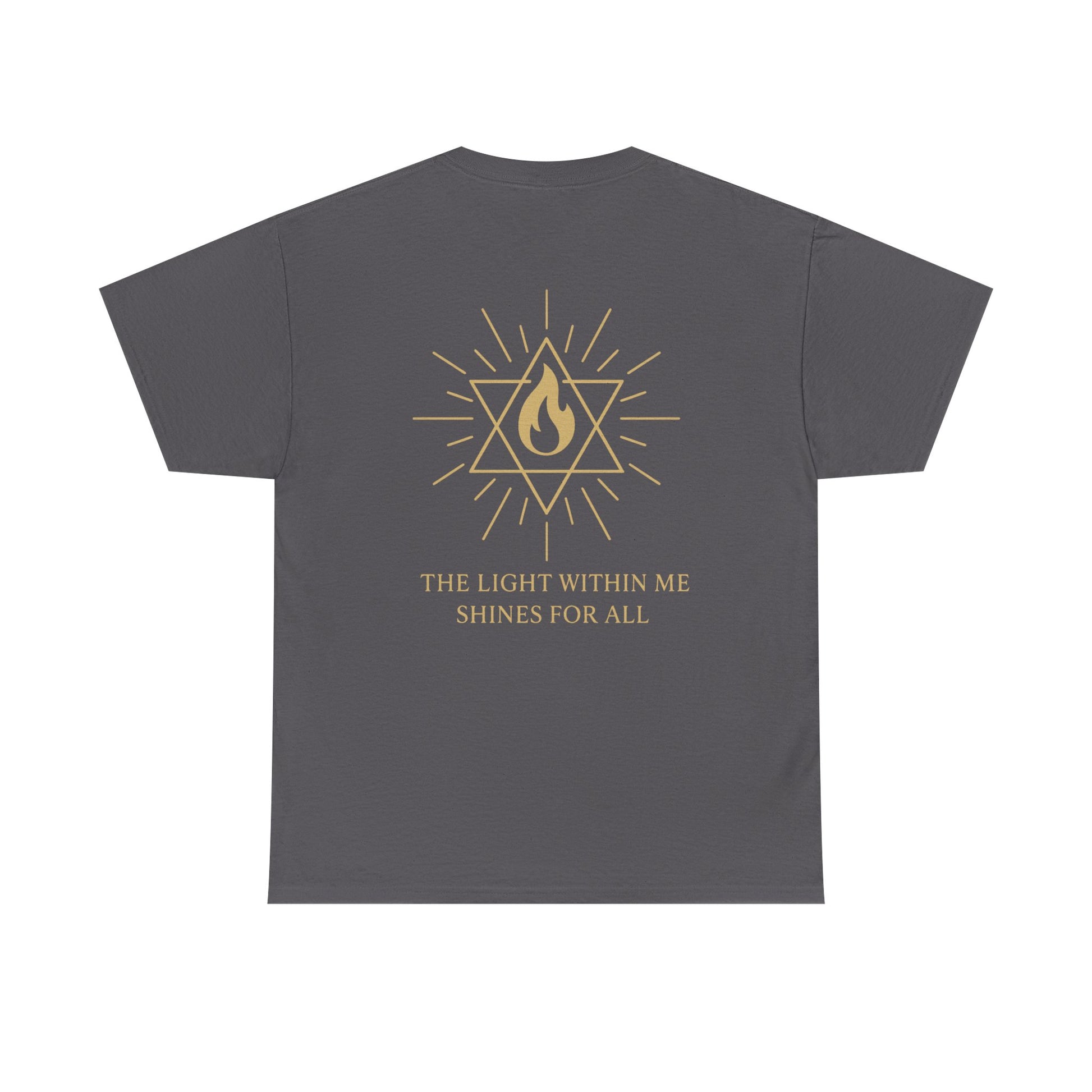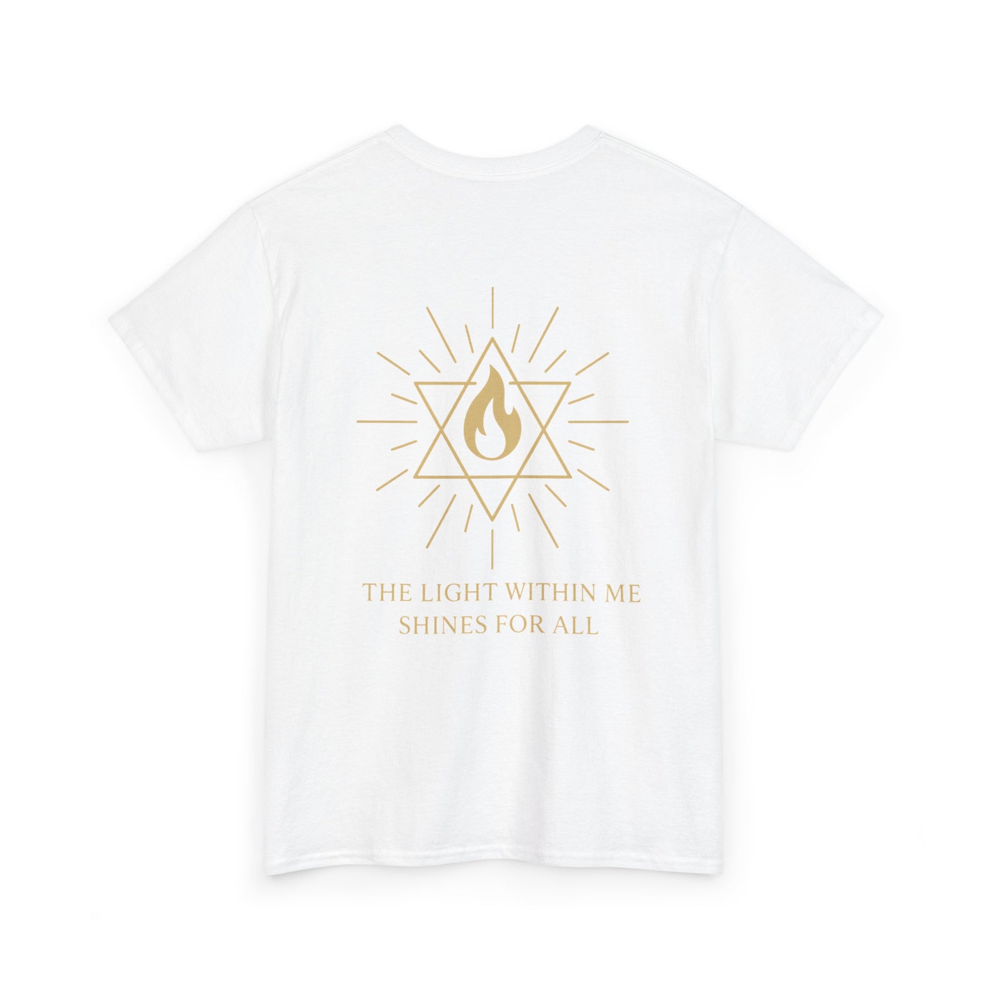 The front features a small merkaba flame emblem over the heart, a subtle reminder that the light of spirit lives within you. On the back, the full Merkaba Flame of Awakening radiates outward with the words The Light Within Me Shines for All a message of unity, compassion, and divine illumination 🔥