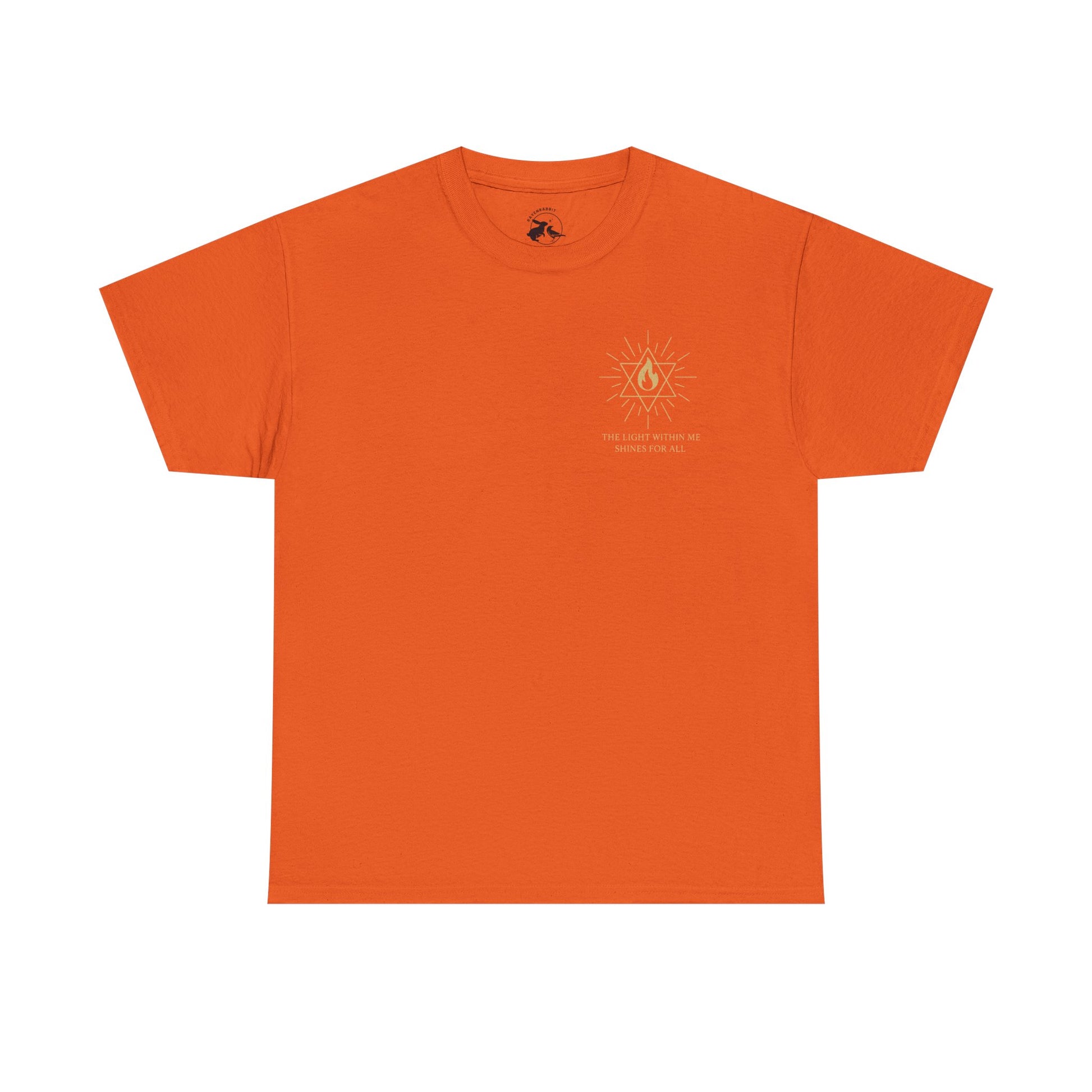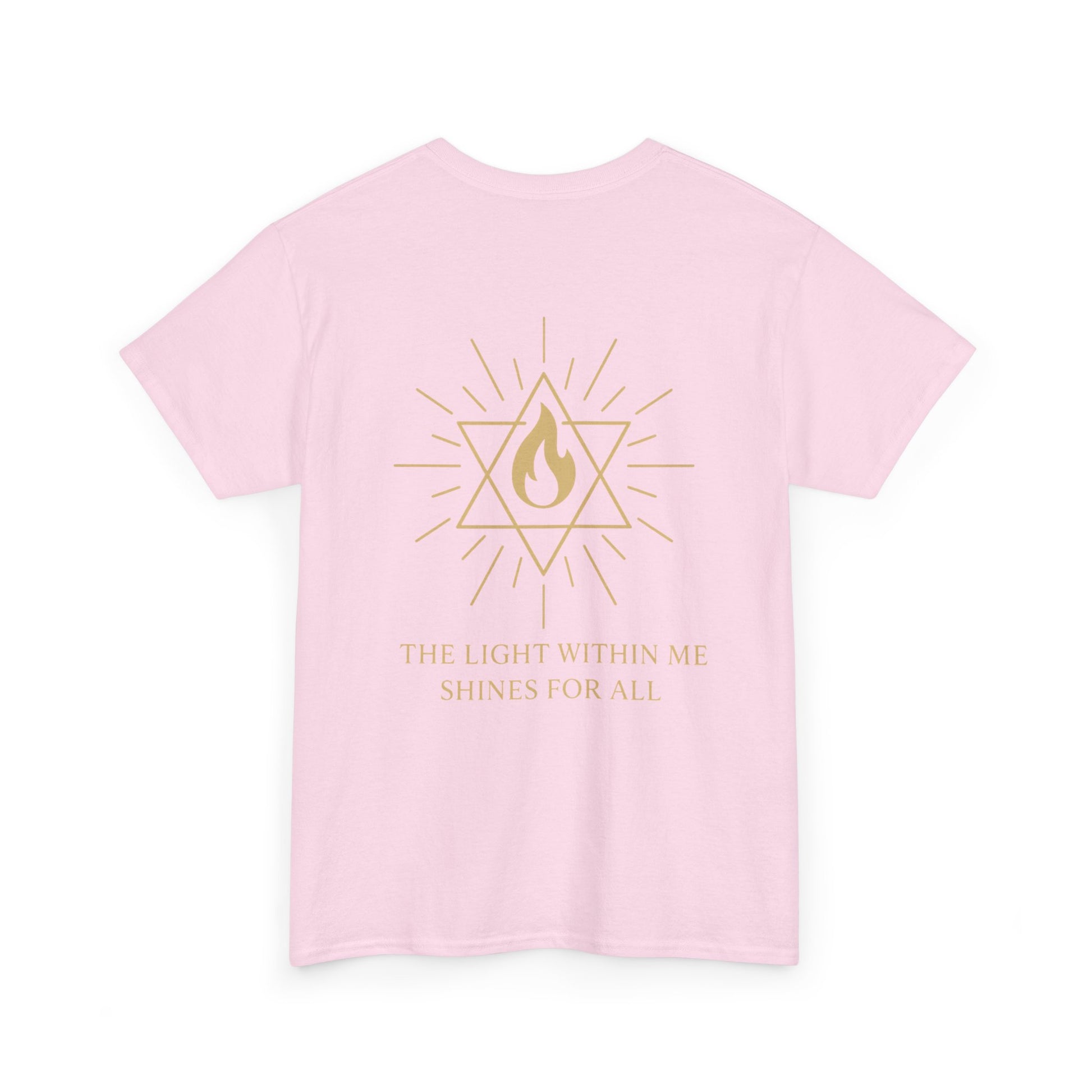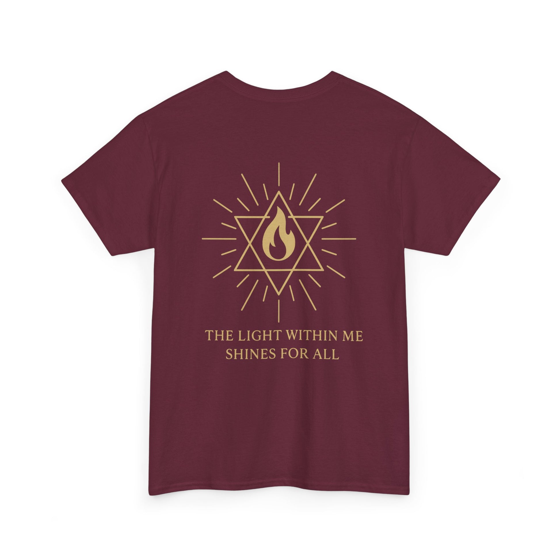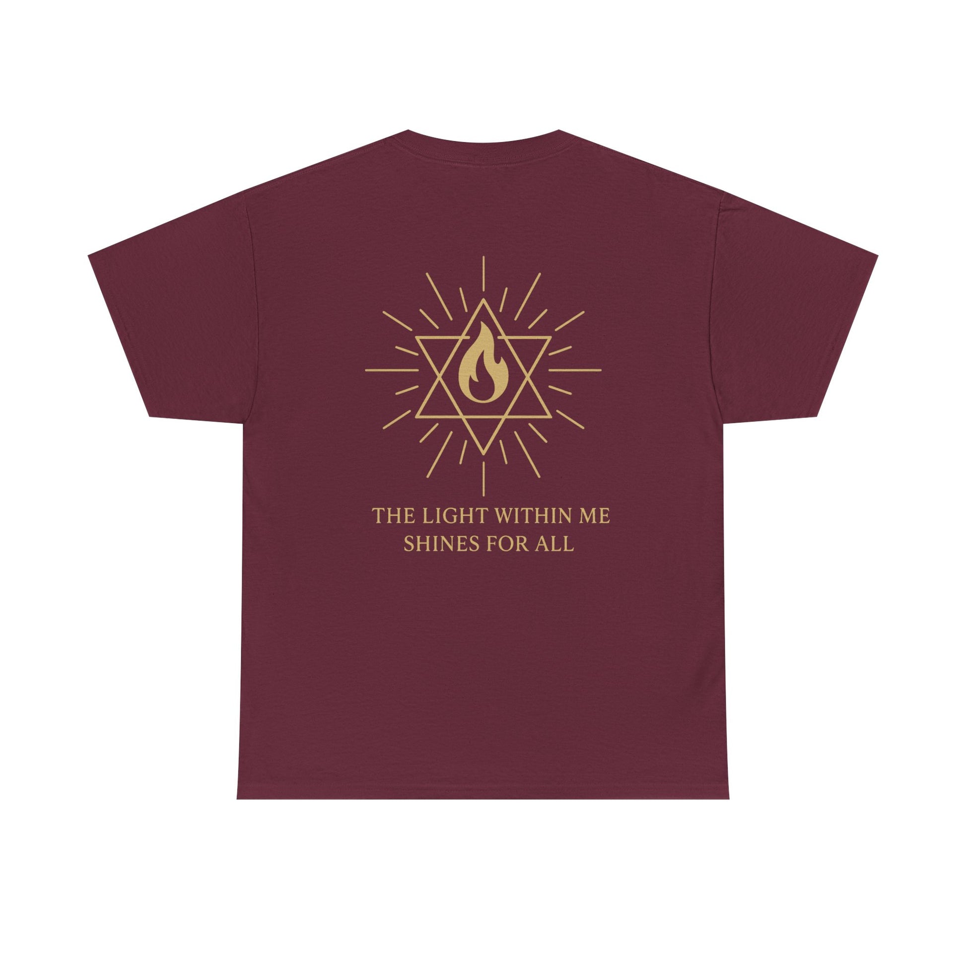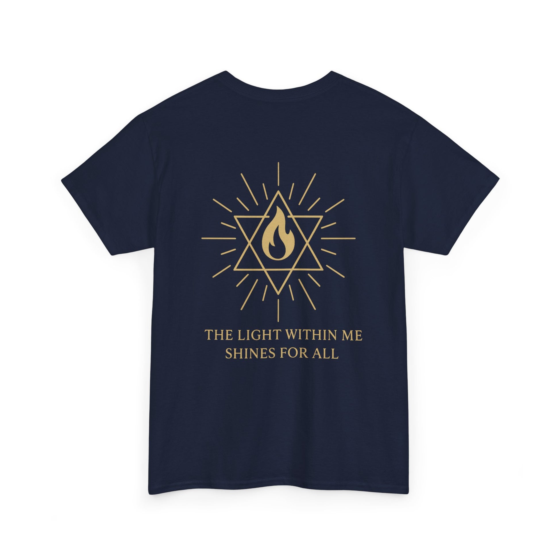 The front features a small merkaba flame emblem over the heart, a subtle reminder that the light of spirit lives within you. On the back, the full Merkaba Flame of Awakening radiates outward with the words The Light Within Me Shines for All a message of unity, compassion, and divine illumination 🔥